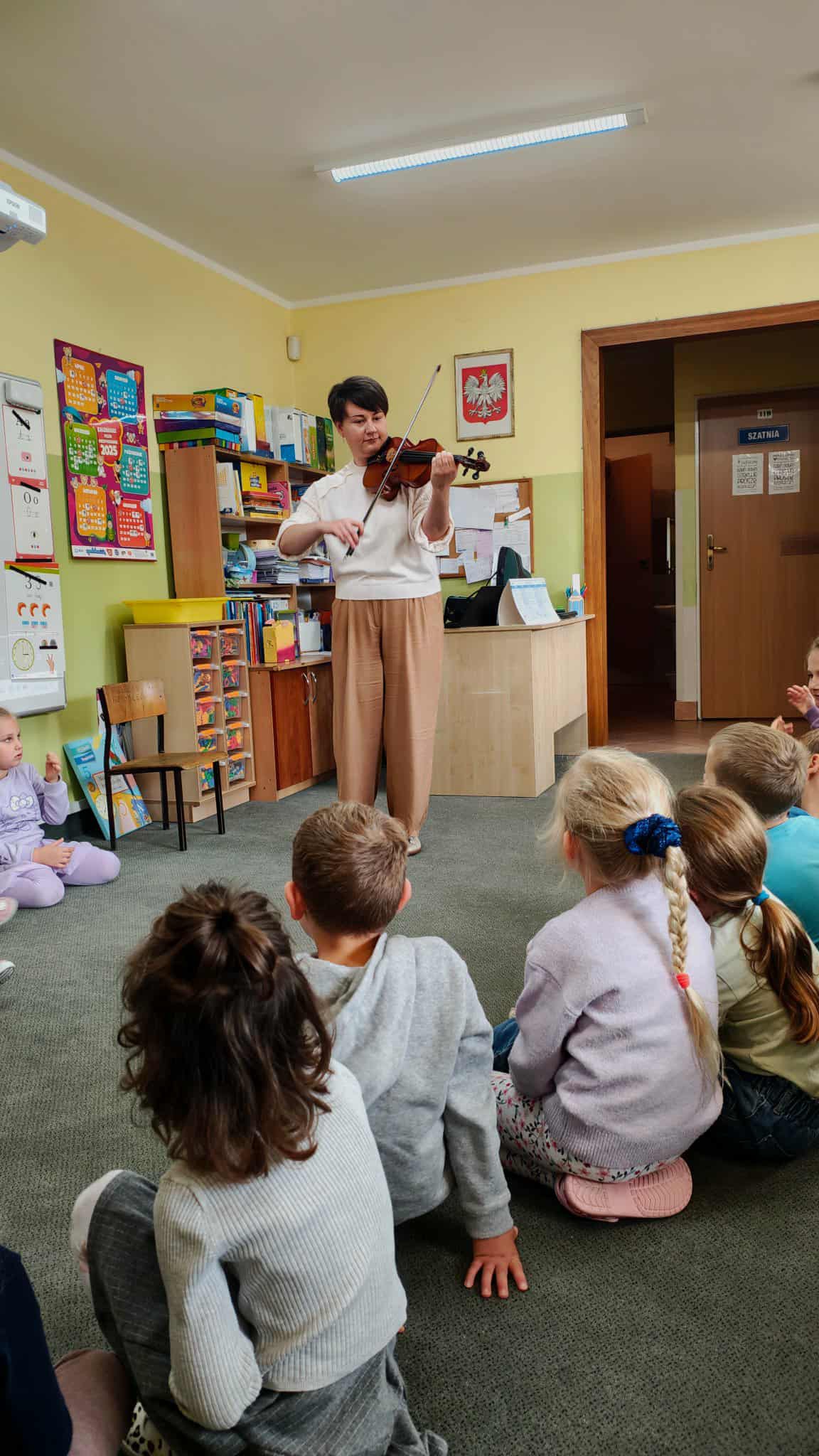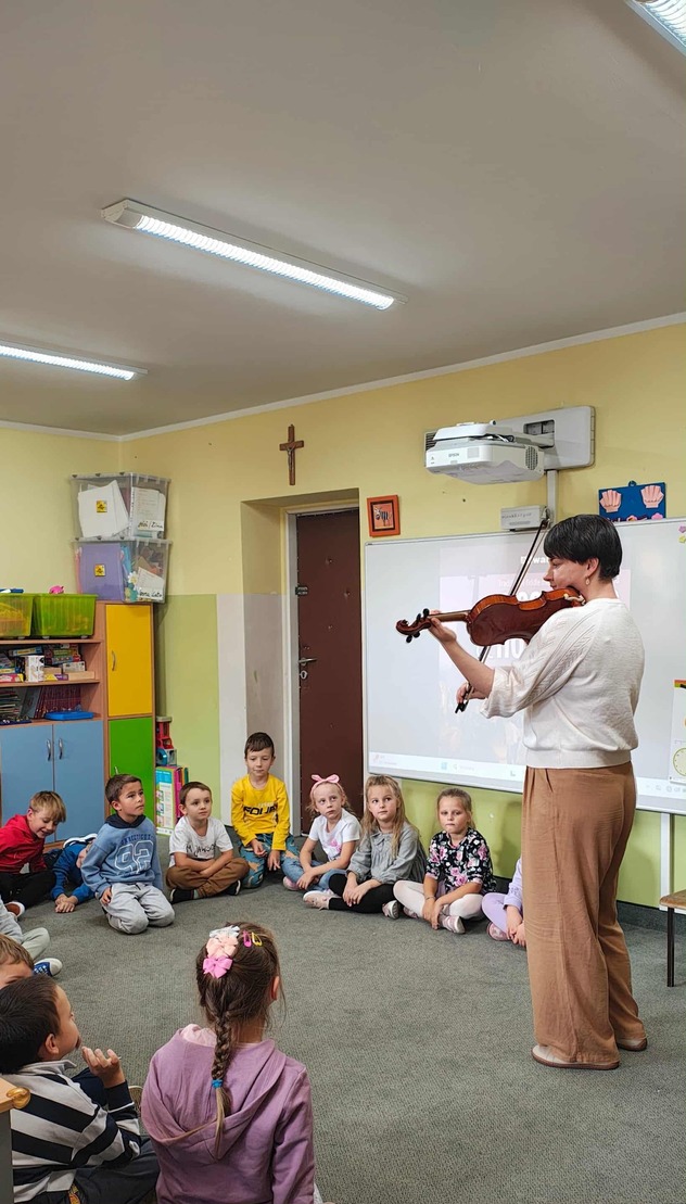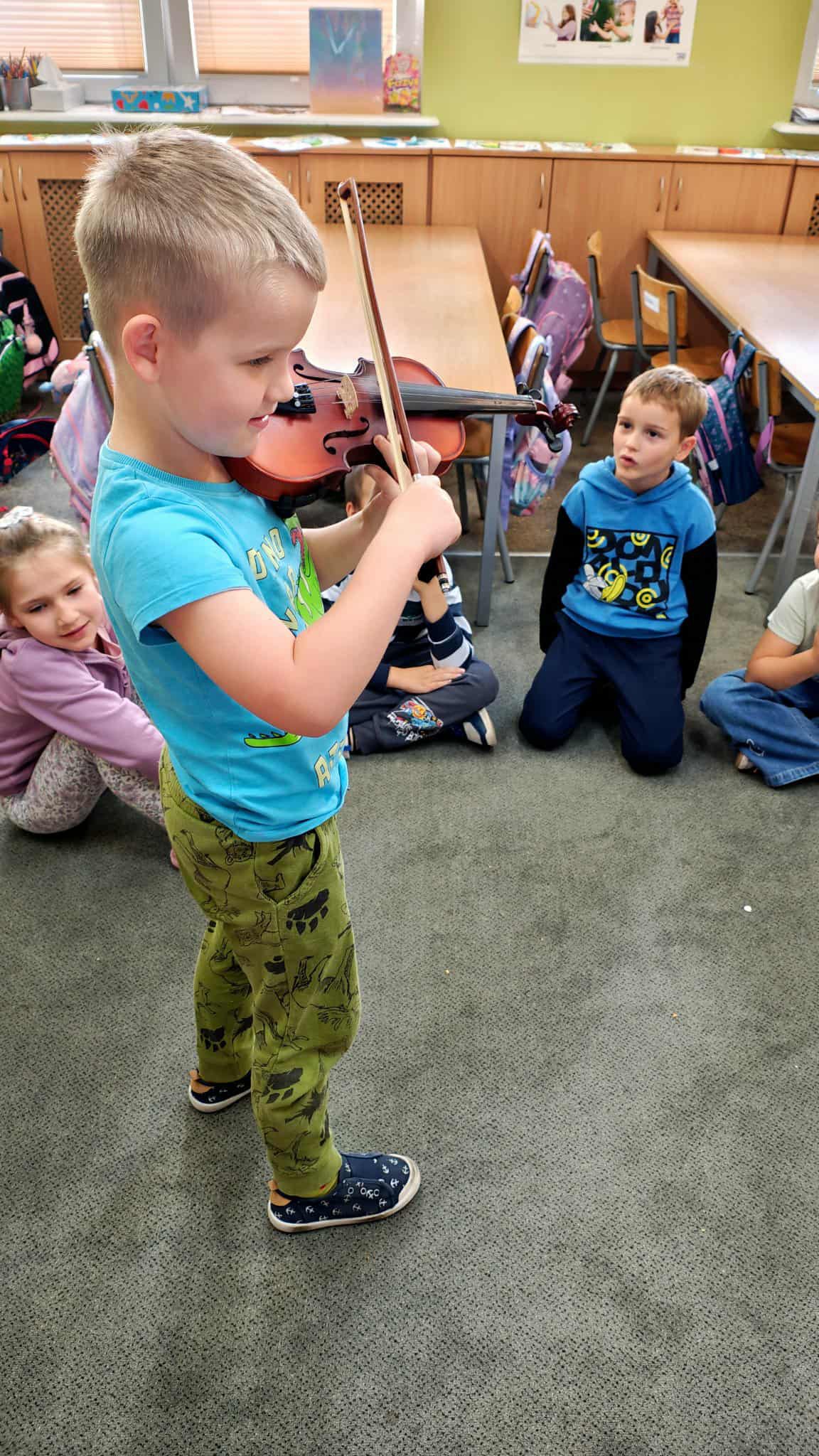 10 października klasa 0a doświadczyła niecodziennego spotkania z muzyką na żywo. Dzieci poznały budowę skrzypiec oraz miały okazję posłuchać brzmienia instrumentu. Najwięcej emocji wzbudziła w uczniach możliwość spróbowania swoich sił w grze na skrzypcach. Każde dziecko wydobyło kilka dźwięków z instrumentu i otrzymało wielkie brawa od reszty grupy za swój mini występ.