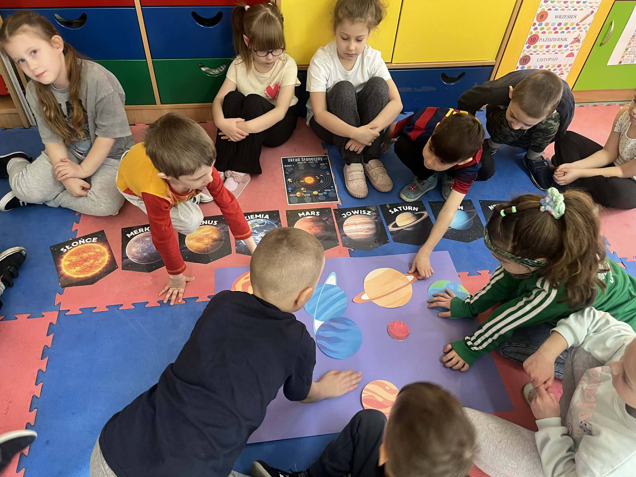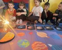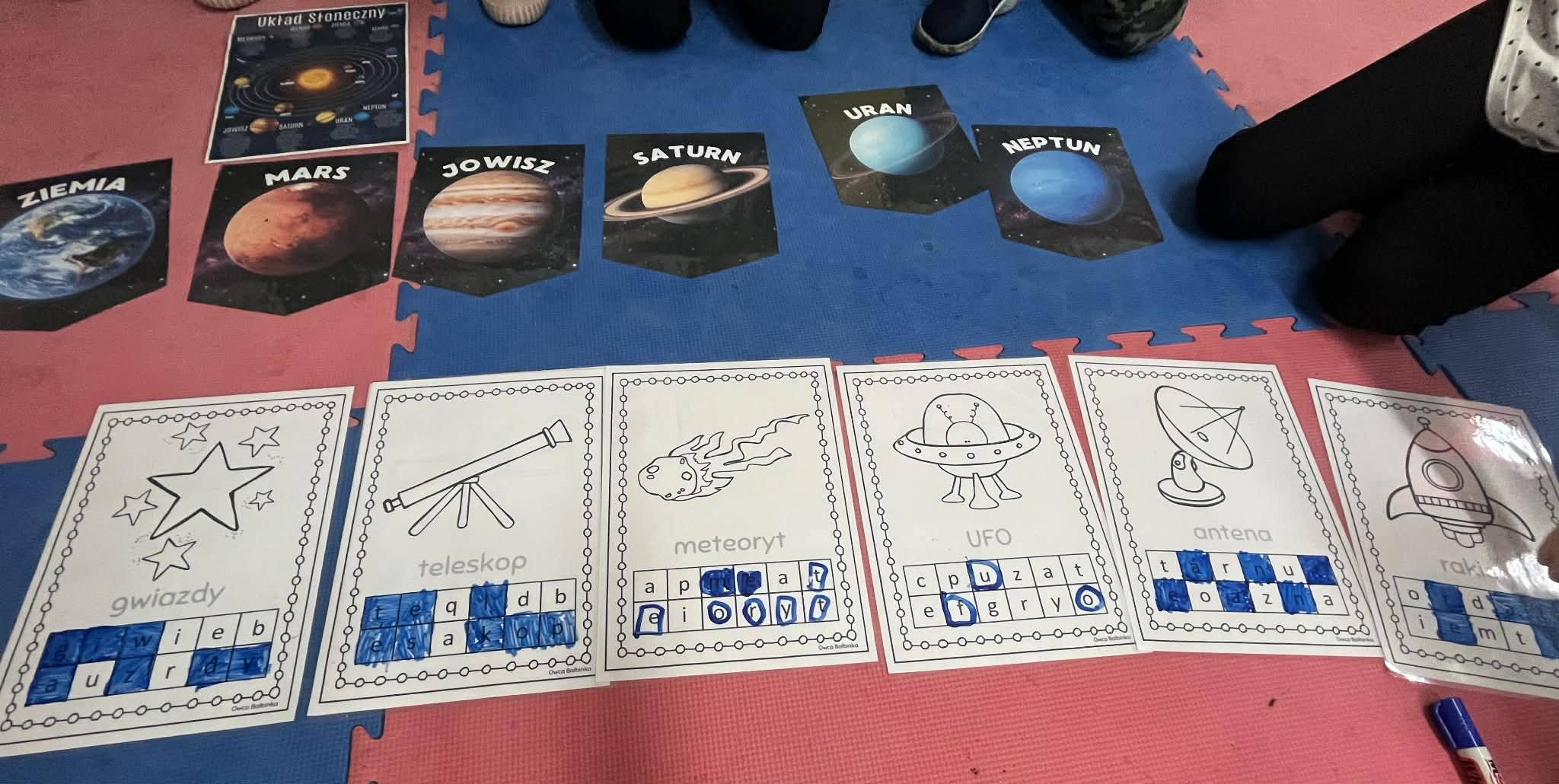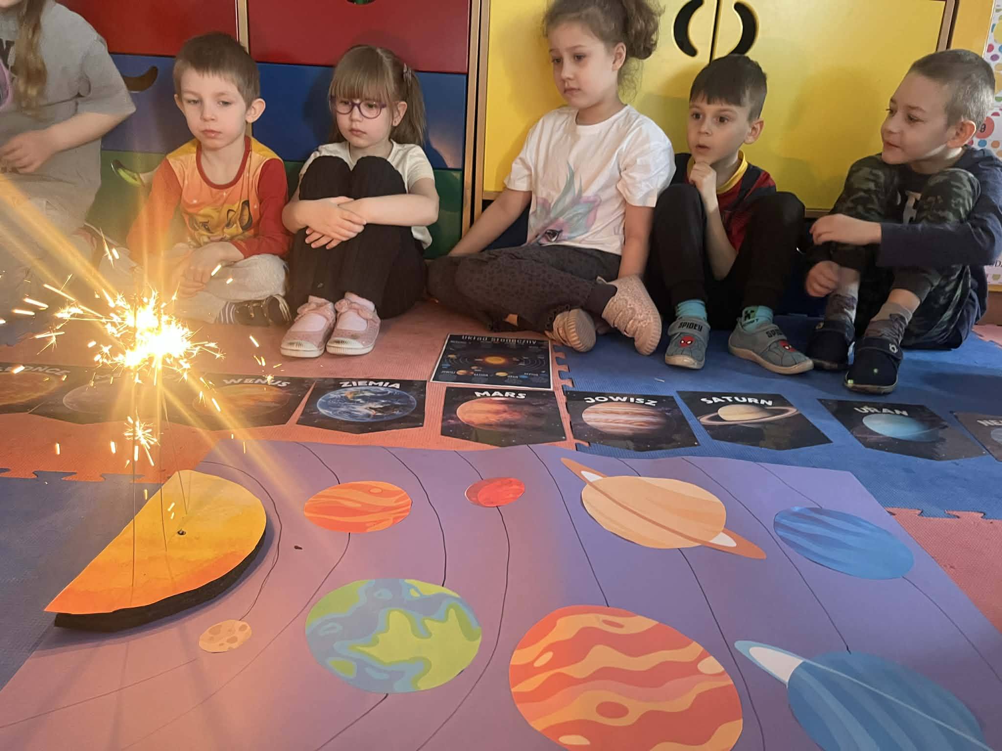 Podczas zajęć rozwijaliśmy także umiejętności polonistyczne – uczniowie z zaangażowaniem wyszukiwali literki ukryte w nazwach obrazków związanych z kosmosem.Największe emocje wzbudził jednak „magiczny Układ Słoneczny”, który stworzyliśmy z użyciem zimnych ogni. Było to niezwykłe doświadczenie, pełne zachwytu, radości i świetnych efektów wizualnych, które na długo pozostaną w pamięci dzieci.