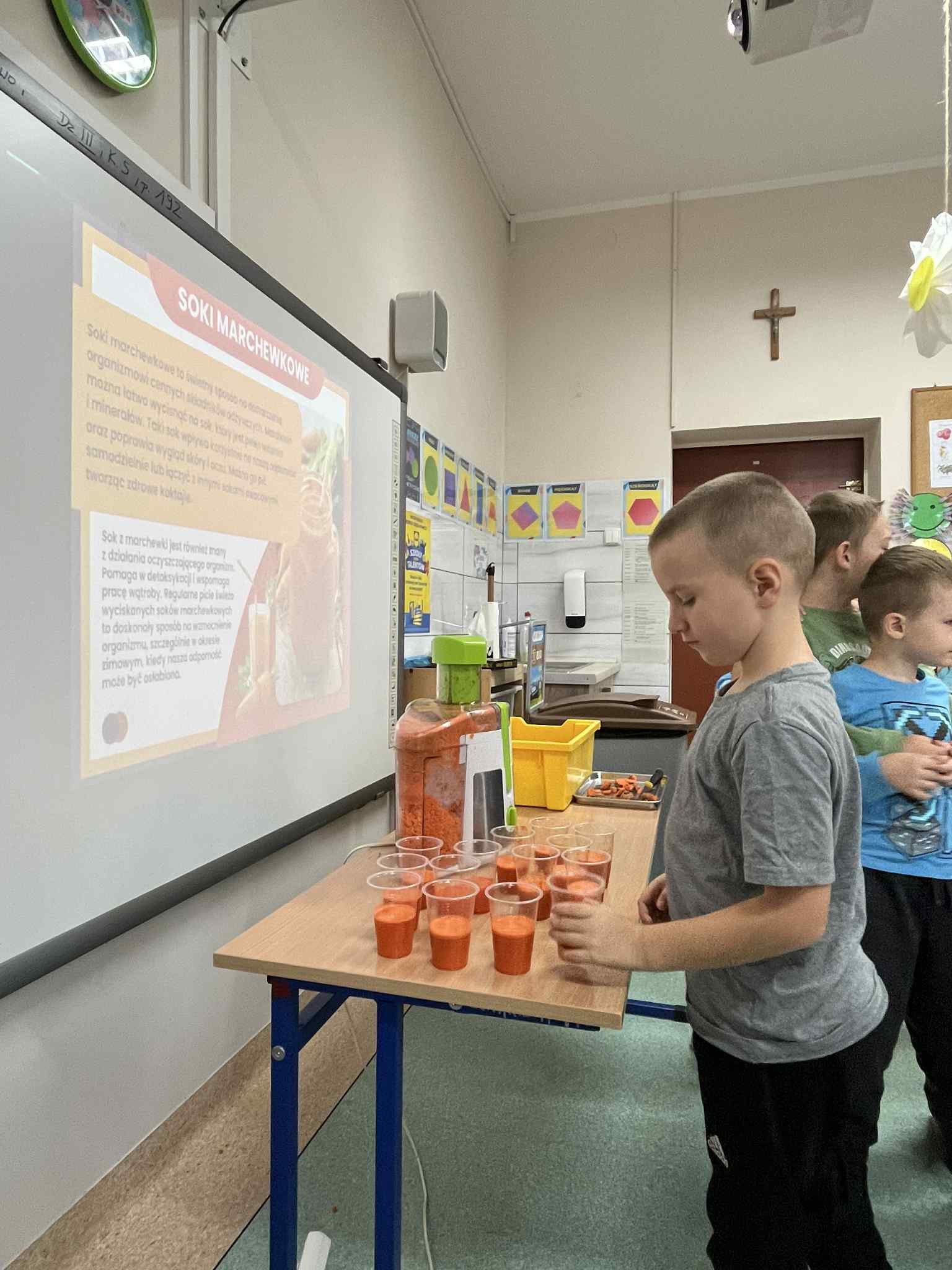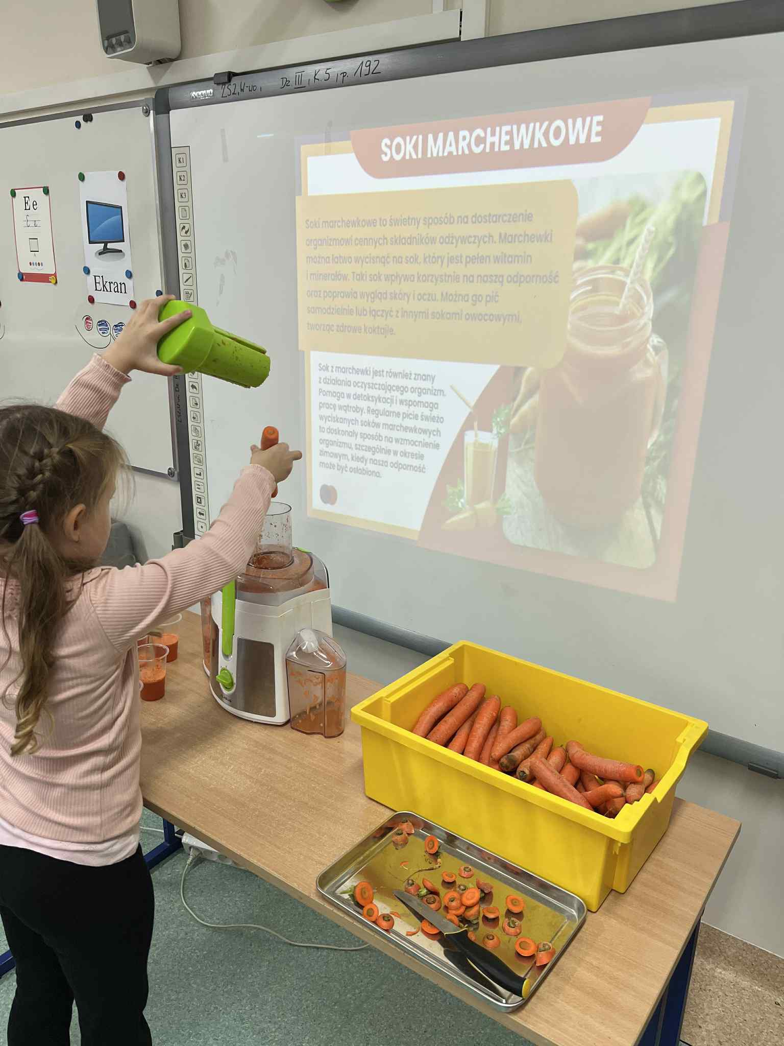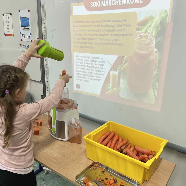 08.10.2025 r. w klasie 0b odbyły się zajęcia kulinarno-edukacyjne, podczas których dzieci przygotowywały świeży sok z marchewki. Na początku rozmawialiśmy o wartościach odżywczych warzyw, a szczególnie o tym, dlaczego marchewka jest zdrowa i jak wpływa na nasze oczy, skórę i odporność. Następnie wspólnie omawialiśmy etapy przygotowania soku – od umycia i obrania marchewek, przez przygotowanie sokowirówki, aż po sam proces wyciskania. Każde dziecko miało okazję włożyć marchewkę do sokowirówki i obserwować, jak powstaje pyszny, marchewkowy sok.Na zakończenie wszyscy mogli spróbować świeżego soku z marchewki, który smakował wyśmienicie! Zajęcia były pełne radości, ciekawych rozmów i zdrowych witamin