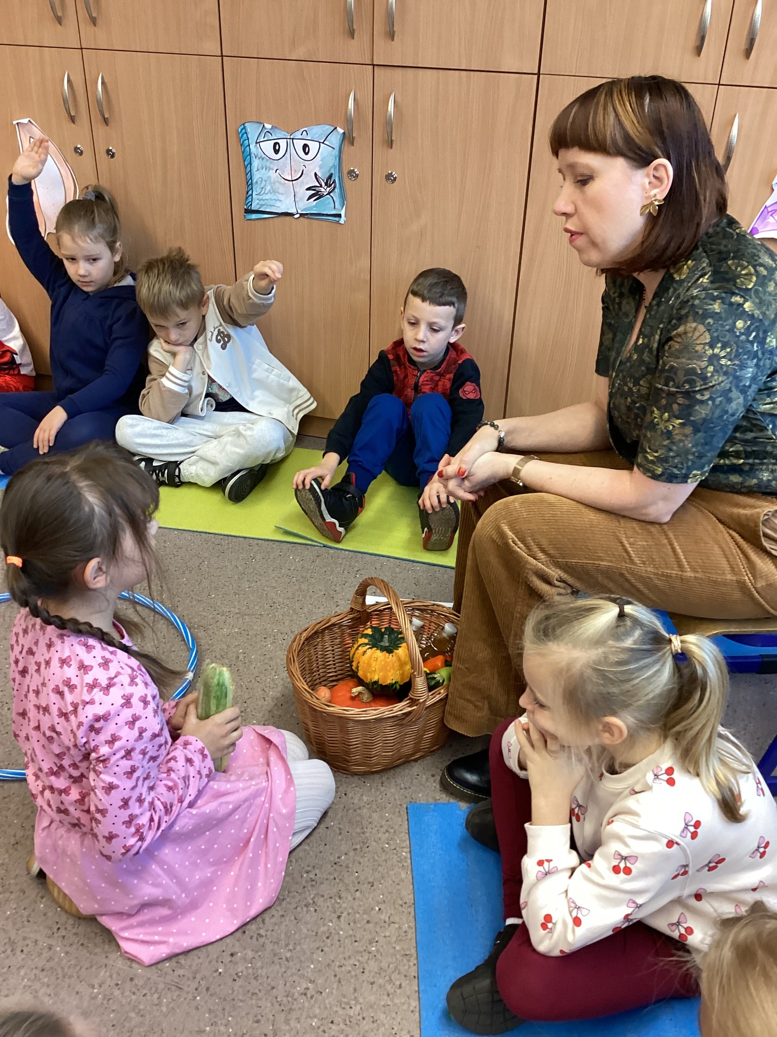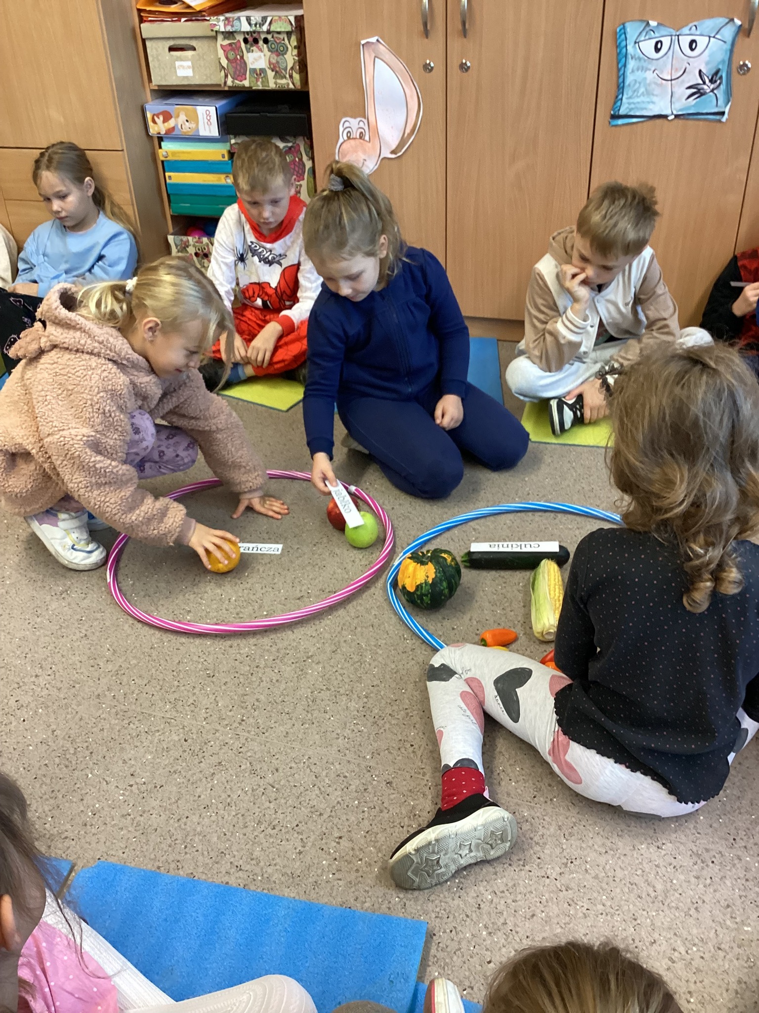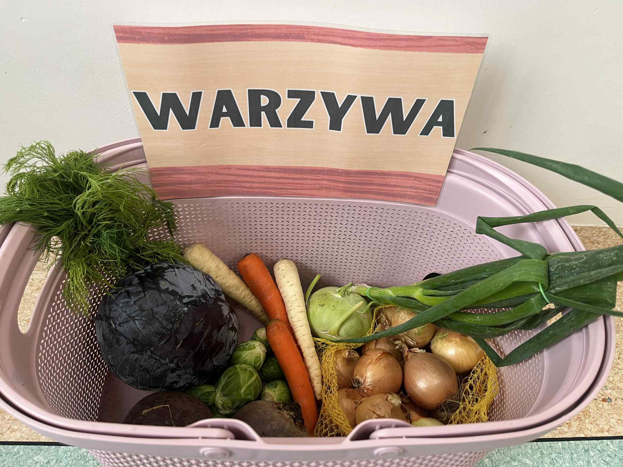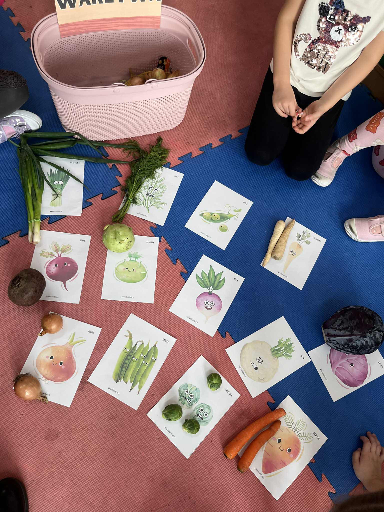 Klasa 0b omawiała temat związany ze zdrowym odżywianiem. Dzieci wysłuchały wiersza Jana Brzechwy pt. „Na straganie”, dzięki któremu poznały różne warzywa i ich znaczenie w codziennej diecie. Następnie uczniowie dopasowywali prawdziwe warzywa do ich ilustracji, utrwalając w ten sposób ich wygląd i nazwy. W ramach zabaw matematycznych przeliczali zebrane warzywa, porównywali ich wielkość i kolory, a także omawiali ich cechy charakterystyczne – kształt, kolor, smak i zapach.Zajęcia miały na celu rozwijanie wiedzy o zdrowym stylu życia, wzbogacanie słownictwa oraz kształtowanie nawyków prozdrowotnych poprzez zabawę i bezpośredni kontakt z naturalnymi produktami