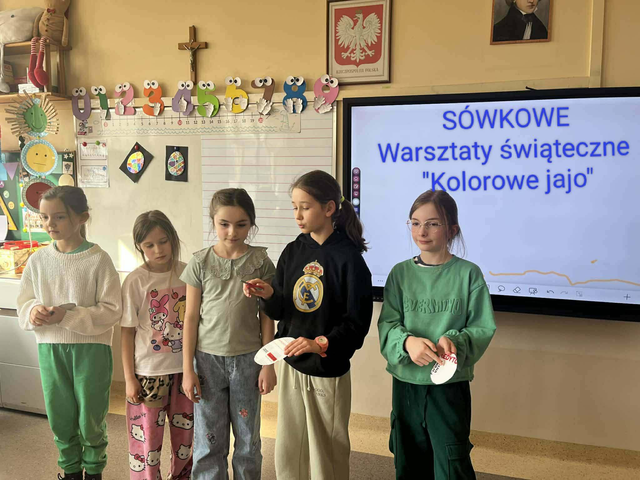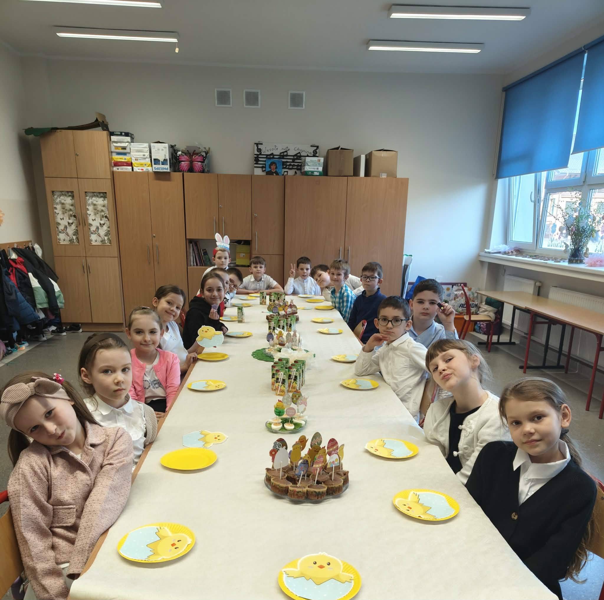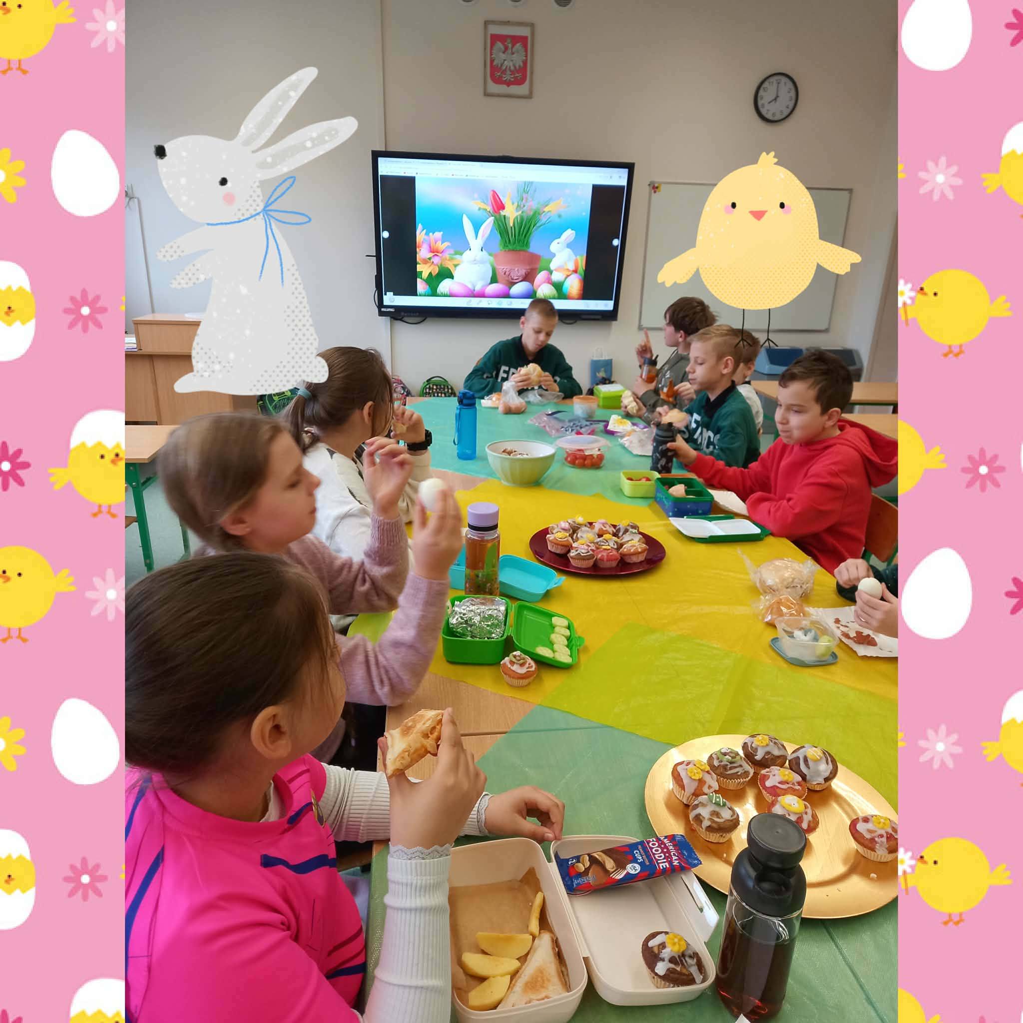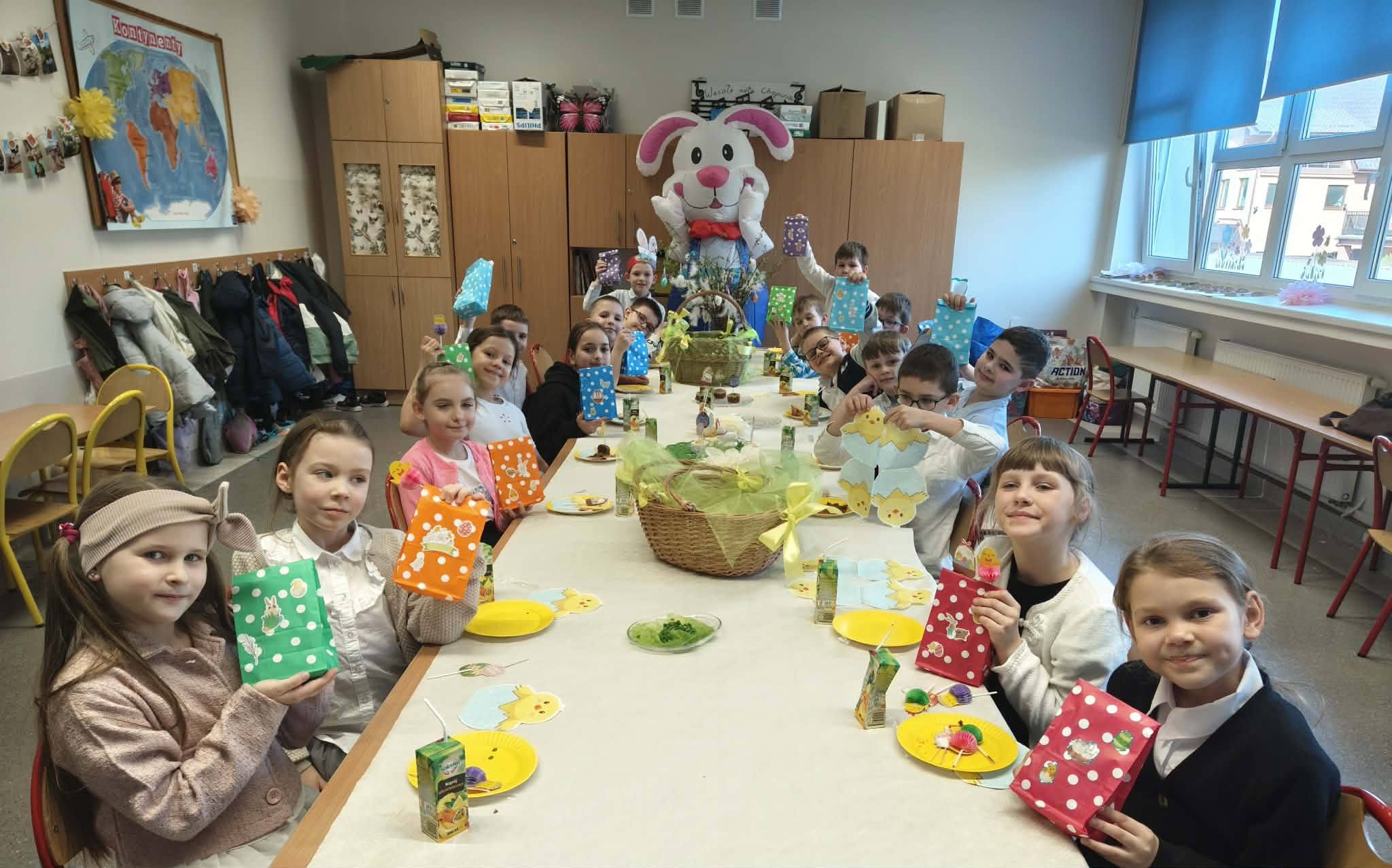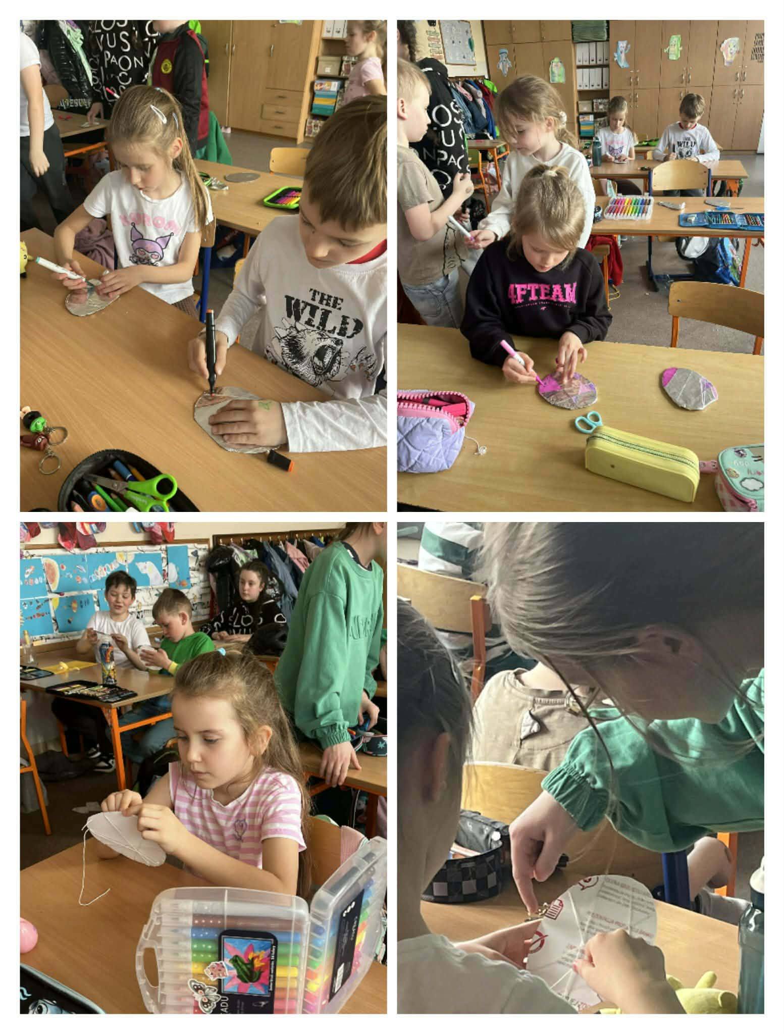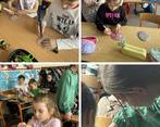 W części artystycznej uczniowie kolorowali drewniane pisanki, wykazując się dużą kreatywnością i starannością. Gotowe prace każde dziecko zabrało ze sobą do domu jako świąteczną pamiątkę.Zajęcia przebiegły w miłej, radosnej atmosferze i pozwoliły dzieciom lepiej poznać tradycje wielkanocne oraz rozwijać swoje umiejętności plastyczne i społeczne.