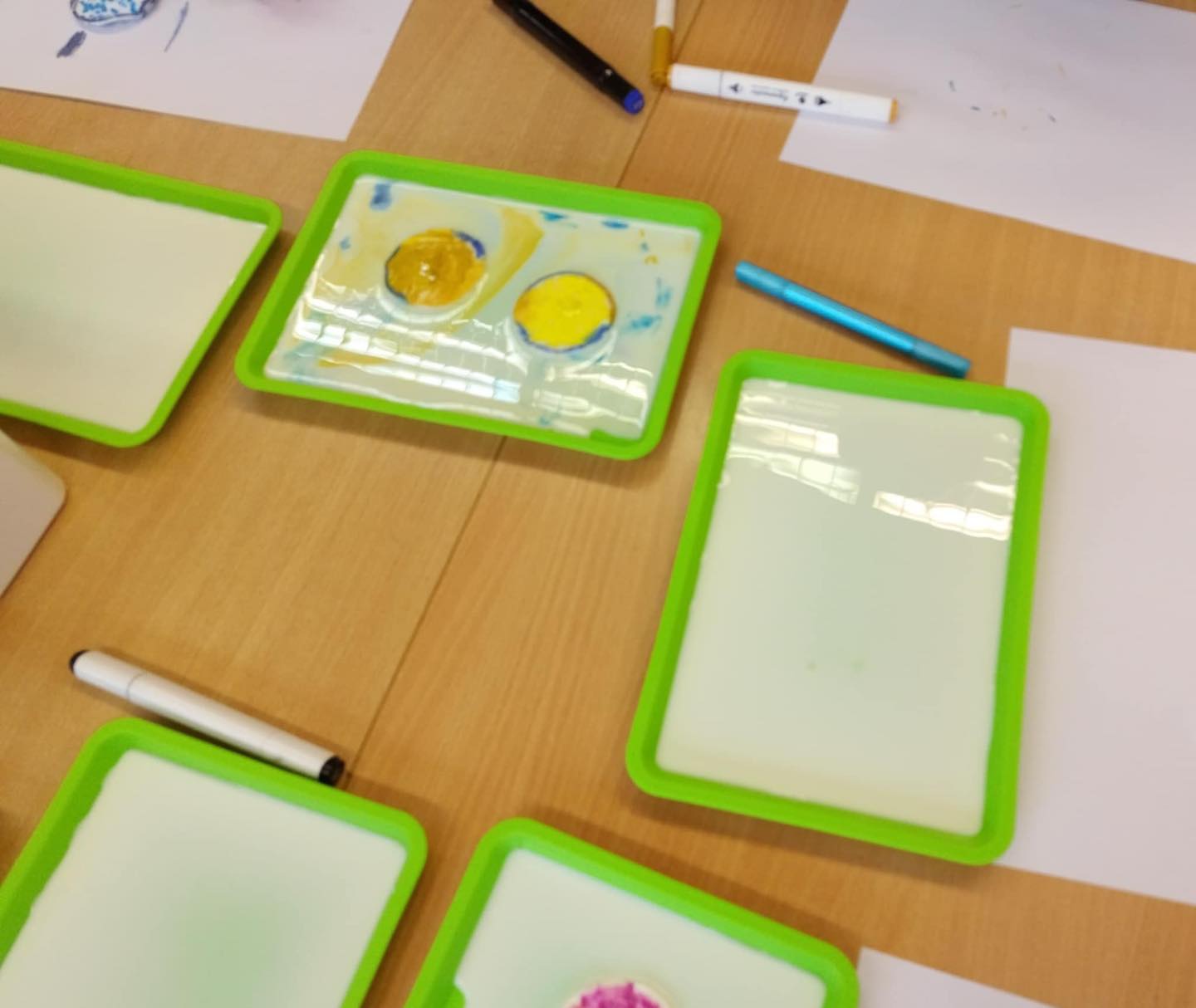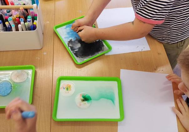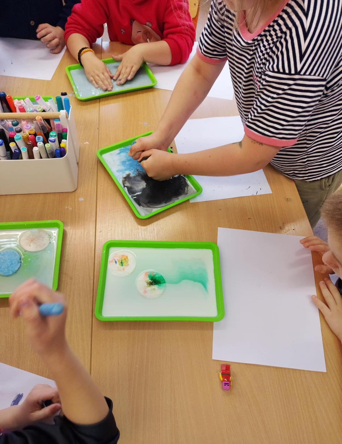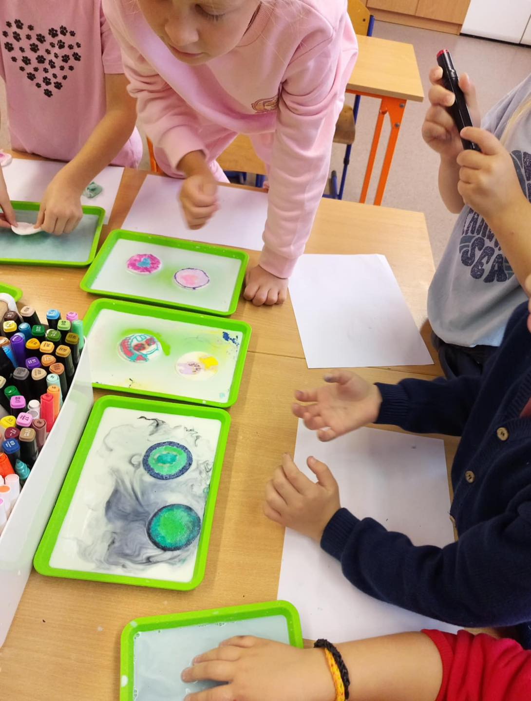 Klasa 1A tworzyła dzisiaj na zajęciach kółka plastycznego barwne eksperymenty z mlekiem. Zaobserwowaliśmy rozbijanie napięcia powierzchniowego przez płyn do naczyń.