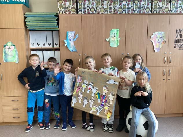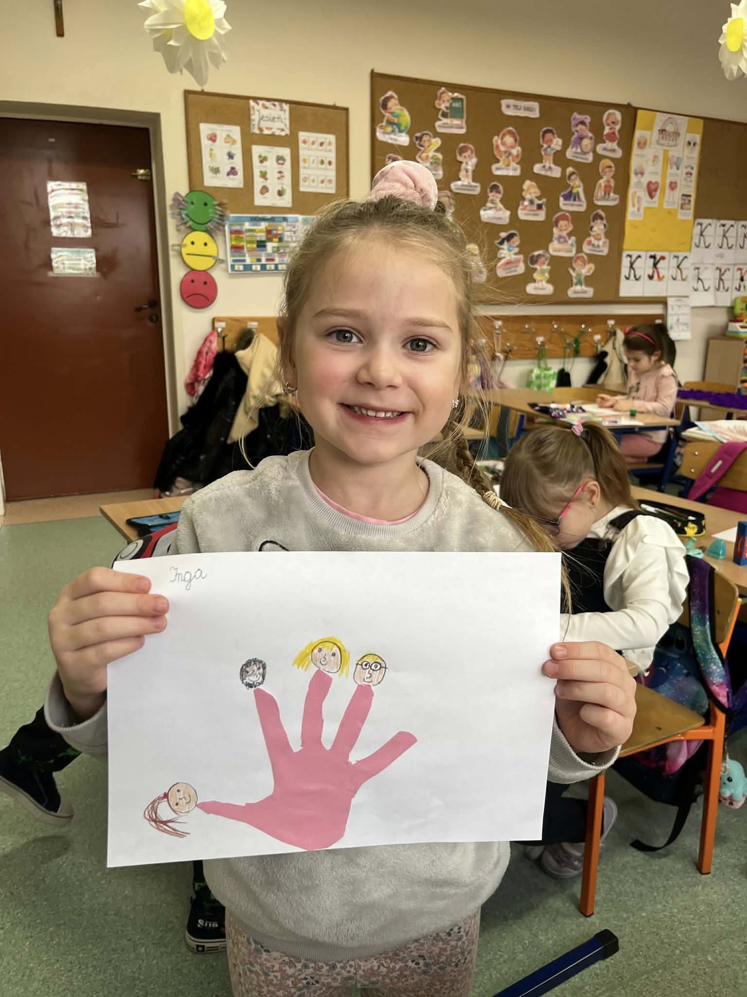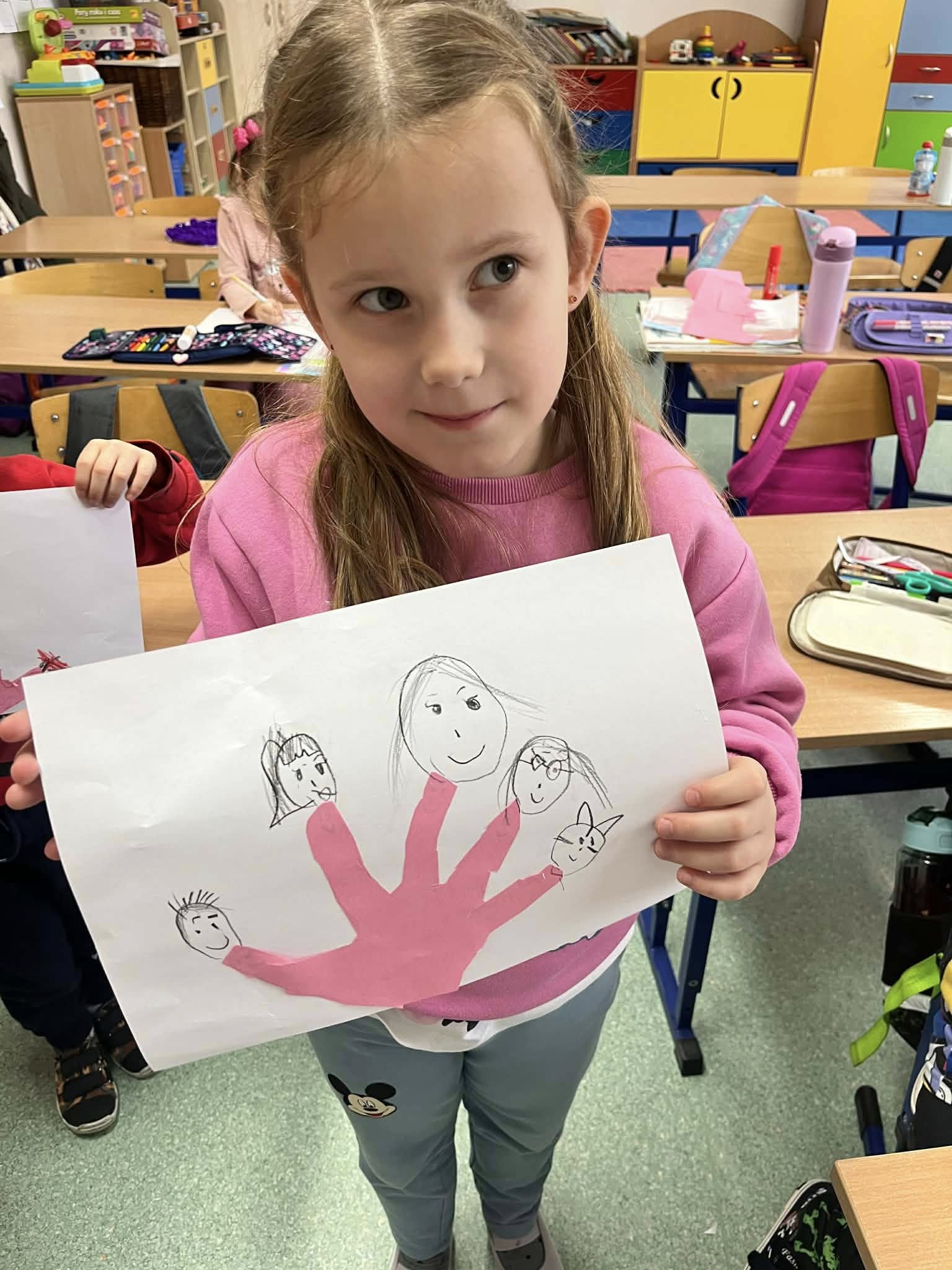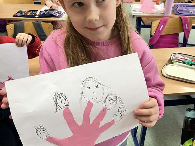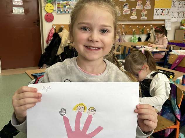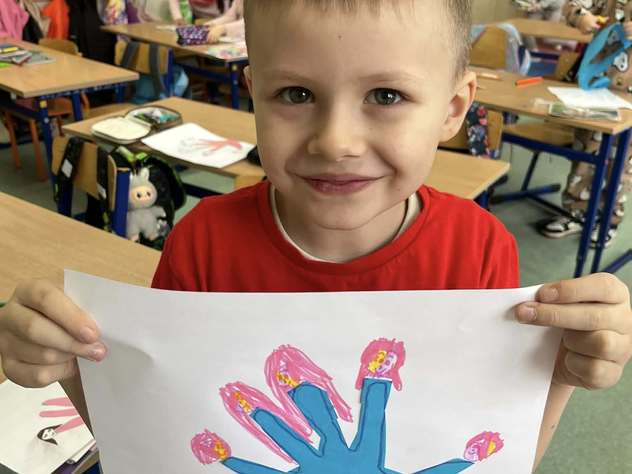 Uczniowie klasy 0b rozmawiali o swoich rodzinach, oglądali zdjęcia z okresu niemowlęctwa oraz fotografie rodzinne. Przeliczali członków rodziny i rozmawiali o ważnych wartościach, takich jak miłość, szacunek, pomoc i troska. Na zakończenie wykonali pracę plastyczną – odrysowywali dłoń, wycinali ją i rysowali przy paluszkach głowy członków swoich rodzin.