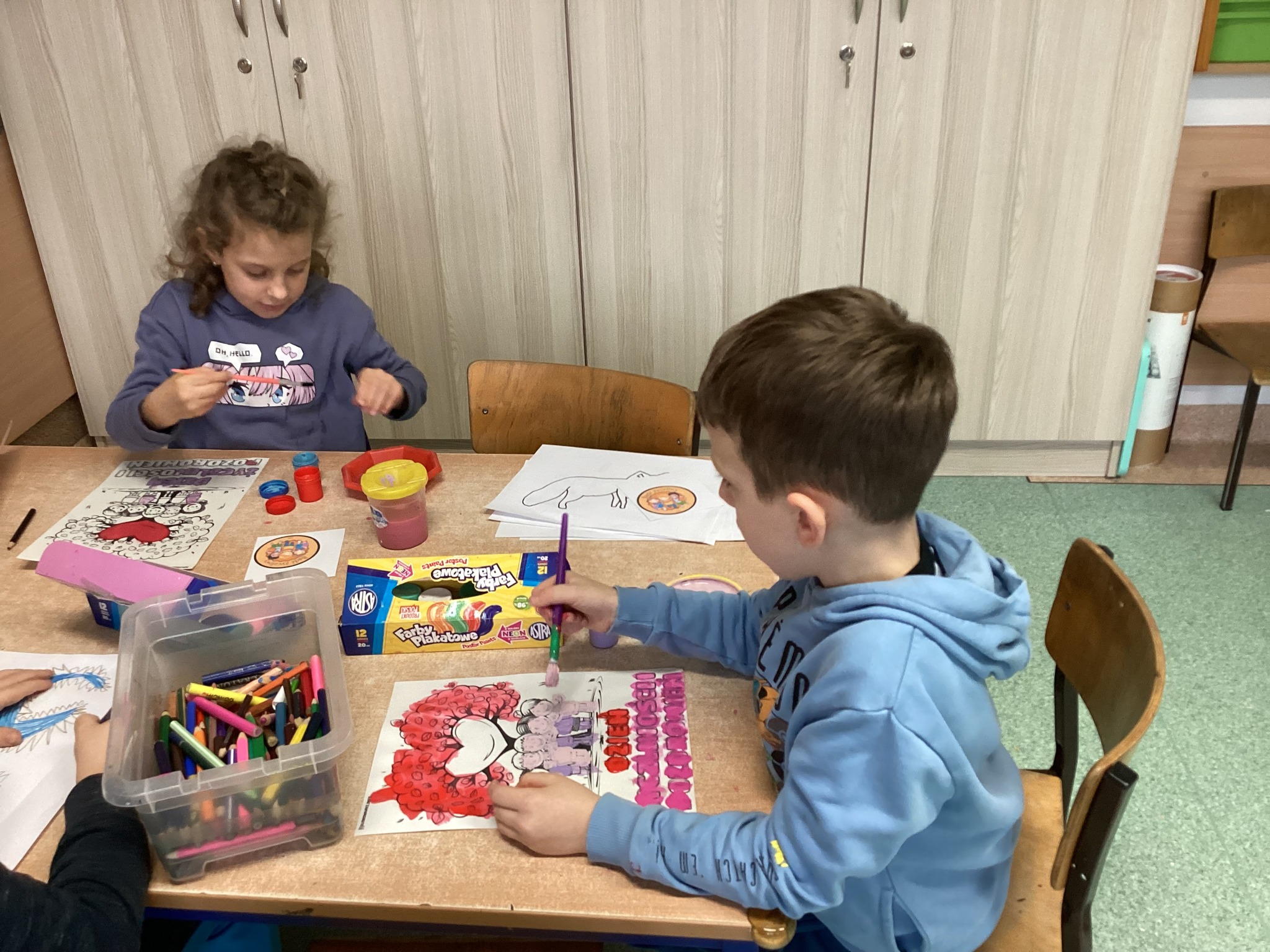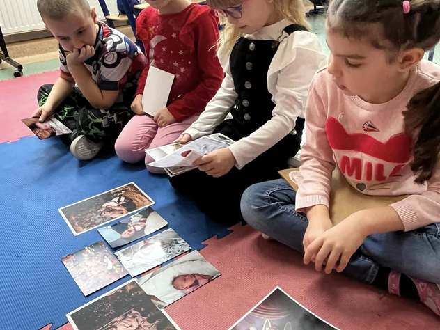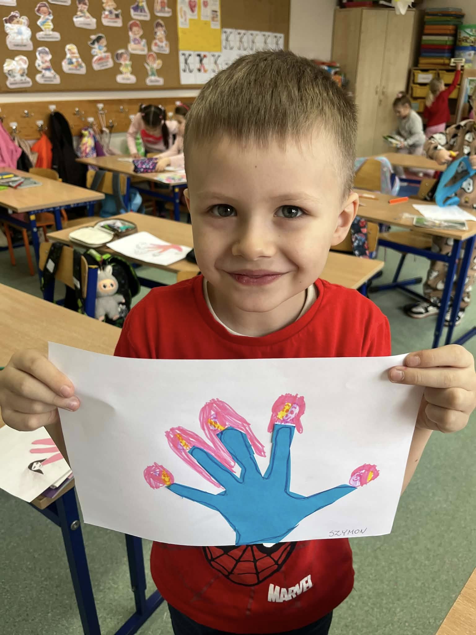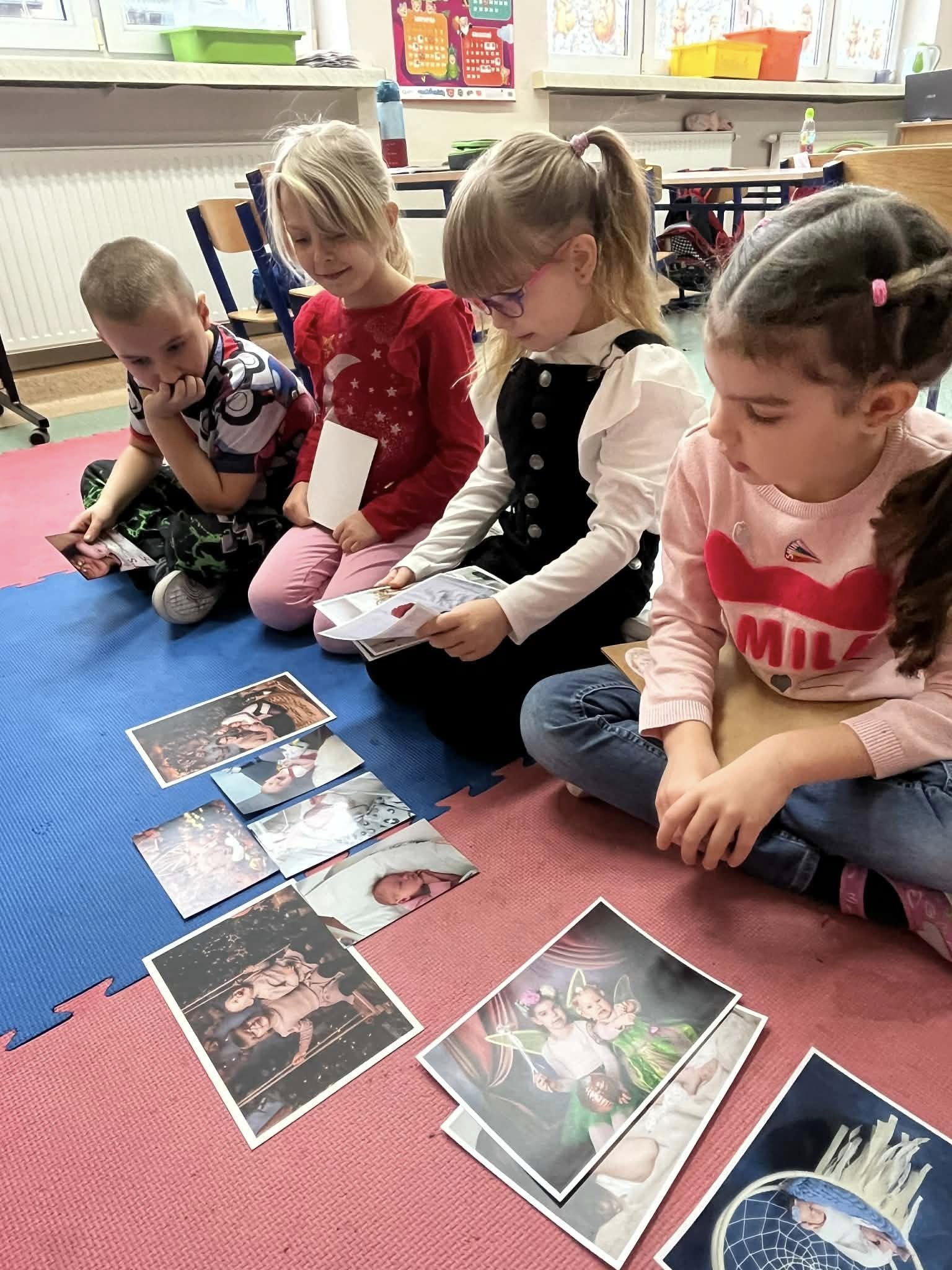 Uczniowie klasy 0b rozmawiali o swoich rodzinach, oglądali zdjęcia z okresu niemowlęctwa oraz fotografie rodzinne. Przeliczali członków rodziny i rozmawiali o ważnych wartościach, takich jak miłość, szacunek, pomoc i troska. Na zakończenie wykonali pracę plastyczną – odrysowywali dłoń, wycinali ją i rysowali przy paluszkach głowy członków swoich rodzin.
