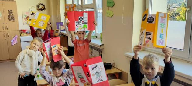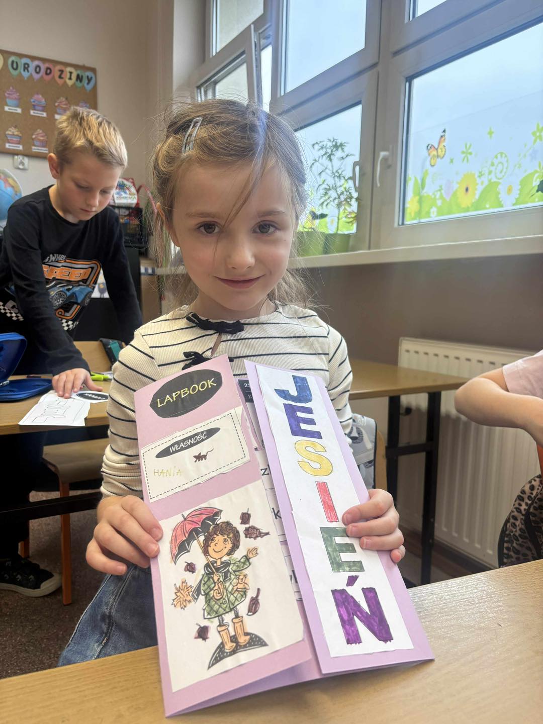 Uczniowie klasy 1A podczas jesiennych zajęć poznawali owoce i warzywa, uczyli się rozróżniać liście drzew oraz uczestniczyli w zajęciach kasztanowej matematyki. Odwiedziła nas pani logopeda - Beata Bonk. Pani Beatka pokazała nam różne ćwiczenia buzi i języka oraz jesienne ćwiczenia motoryki małej. Zwieńczeniem naszych jesiennych zajęć były własnoręcznie wykonane lapbooki. Uczniowie klasy 2a również utworzyli przepiękne, jesienne prace. Jesień już na dobre zawitała również w "Klasie Sowy" (IIIa).
