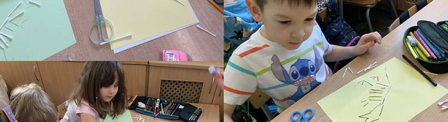 Klasa 1a wykonała zadanie sprawdzające umiejętność dodawania i odejmowania w zakresie 10. Uczniowie wykonali matematyczne chmurki, z których następnie wycinali poznane cyfry i za pomocą kostki do gry tworzyli własne działania matematyczne.