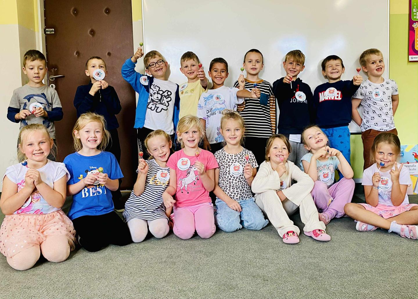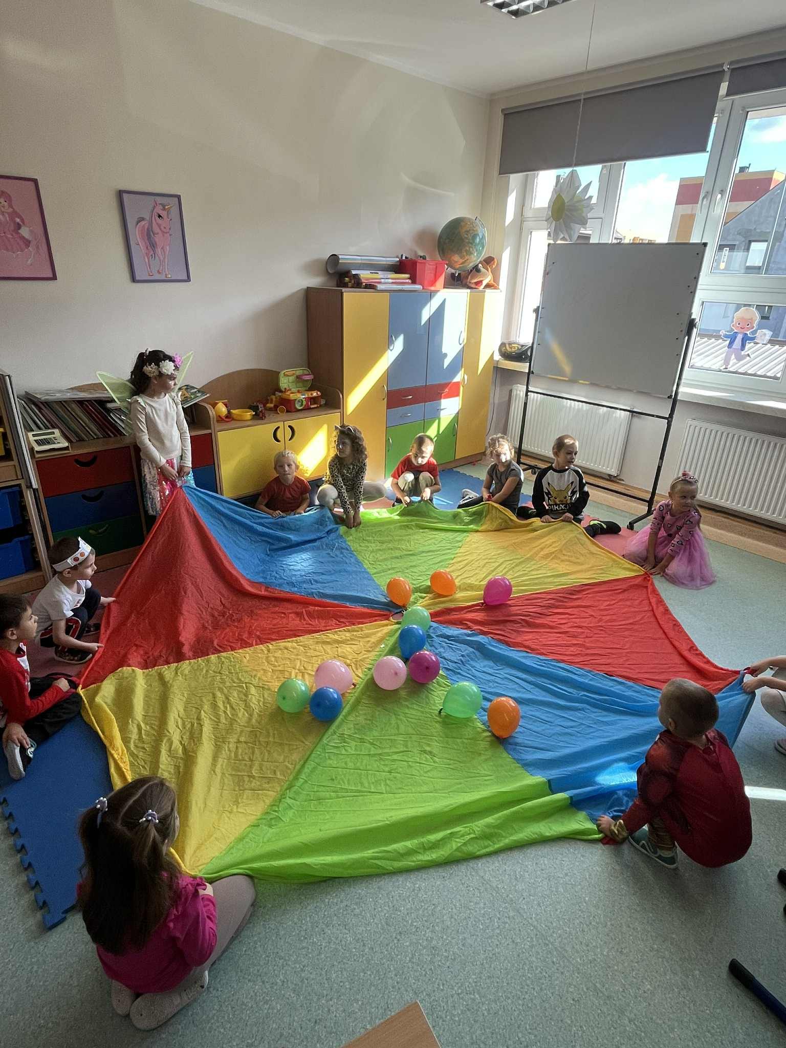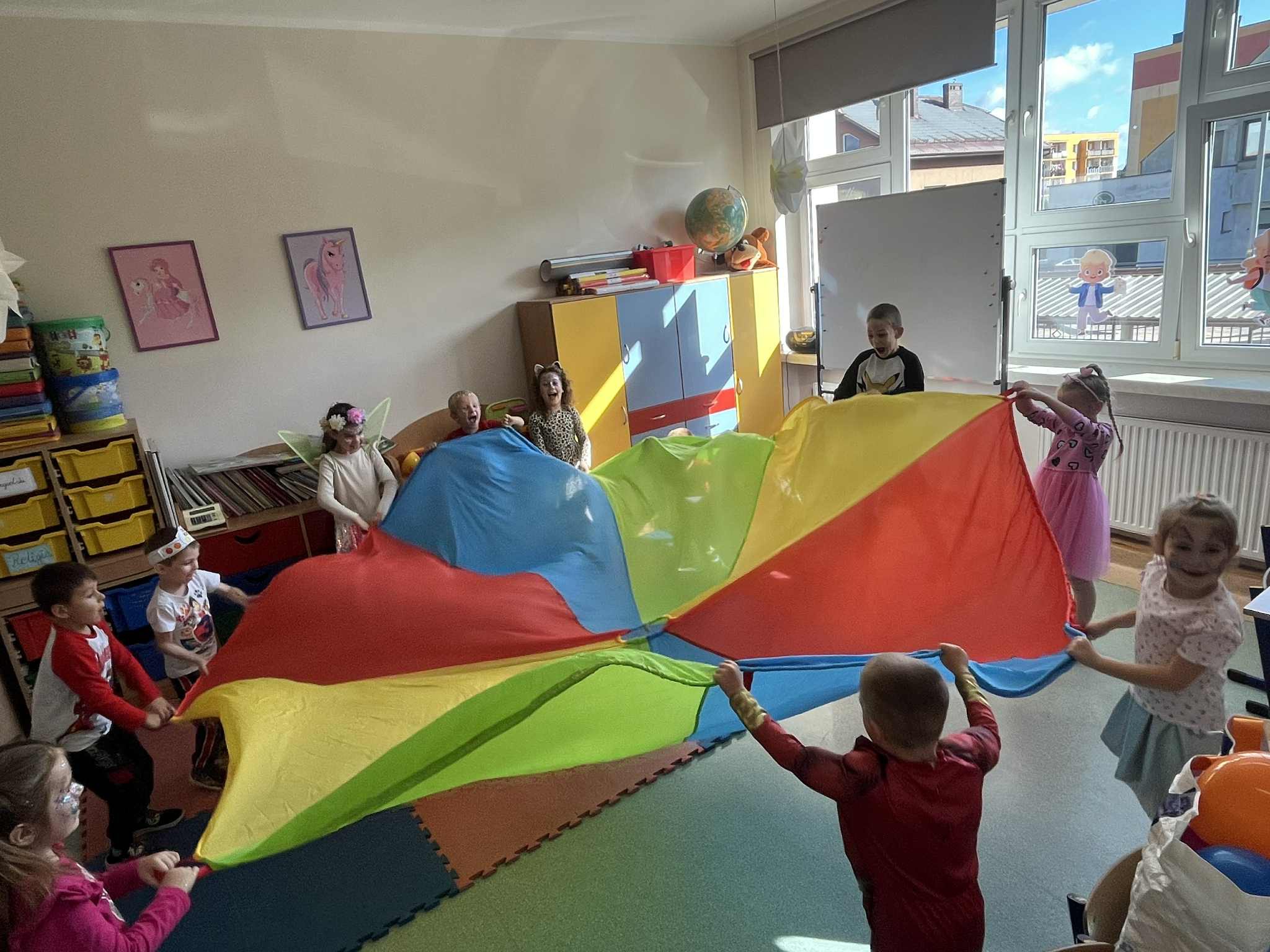 i nauki. Dzieci z klasy 0b bawiły się z kolorową chustą animacyjną, tańczyły przy muzyce i wspólnie tworzyły swoje wyjątkowe Paszporty Super Przedszkolaka. Nie zabrakło też słodkiego poczęstunku, który dodał energii do dalszych harców. Każdy otrzymał dyplom i wierszyk od pani wychowawczyni.