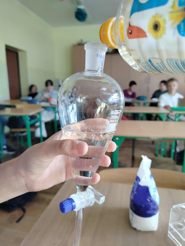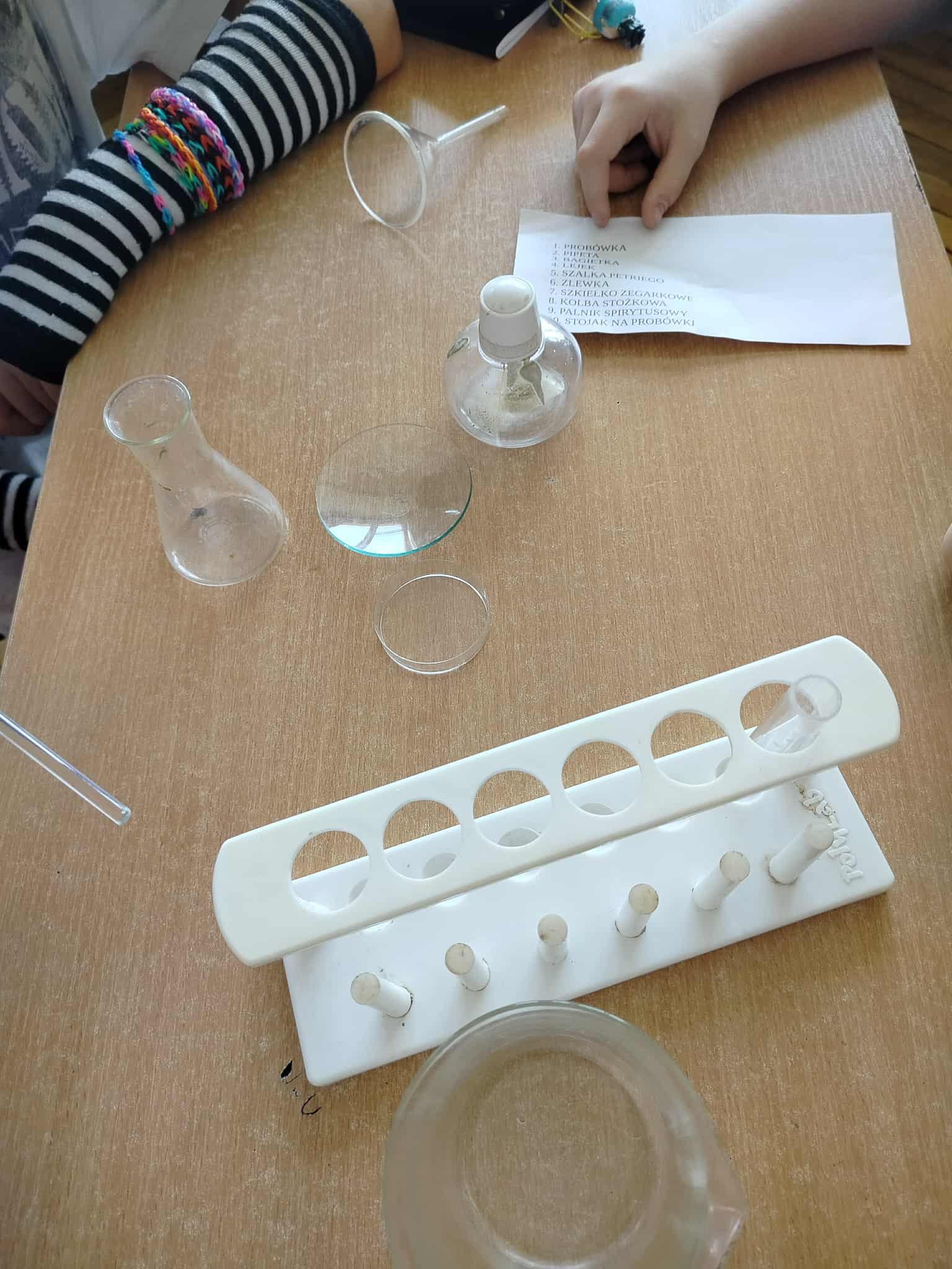 Uczniowie poznali szkło, sprzęt laboratoryjny, badają gęstość substancji i rozdzielają mieszaniny. Pracują z wielkim zaangażowaniem.