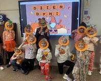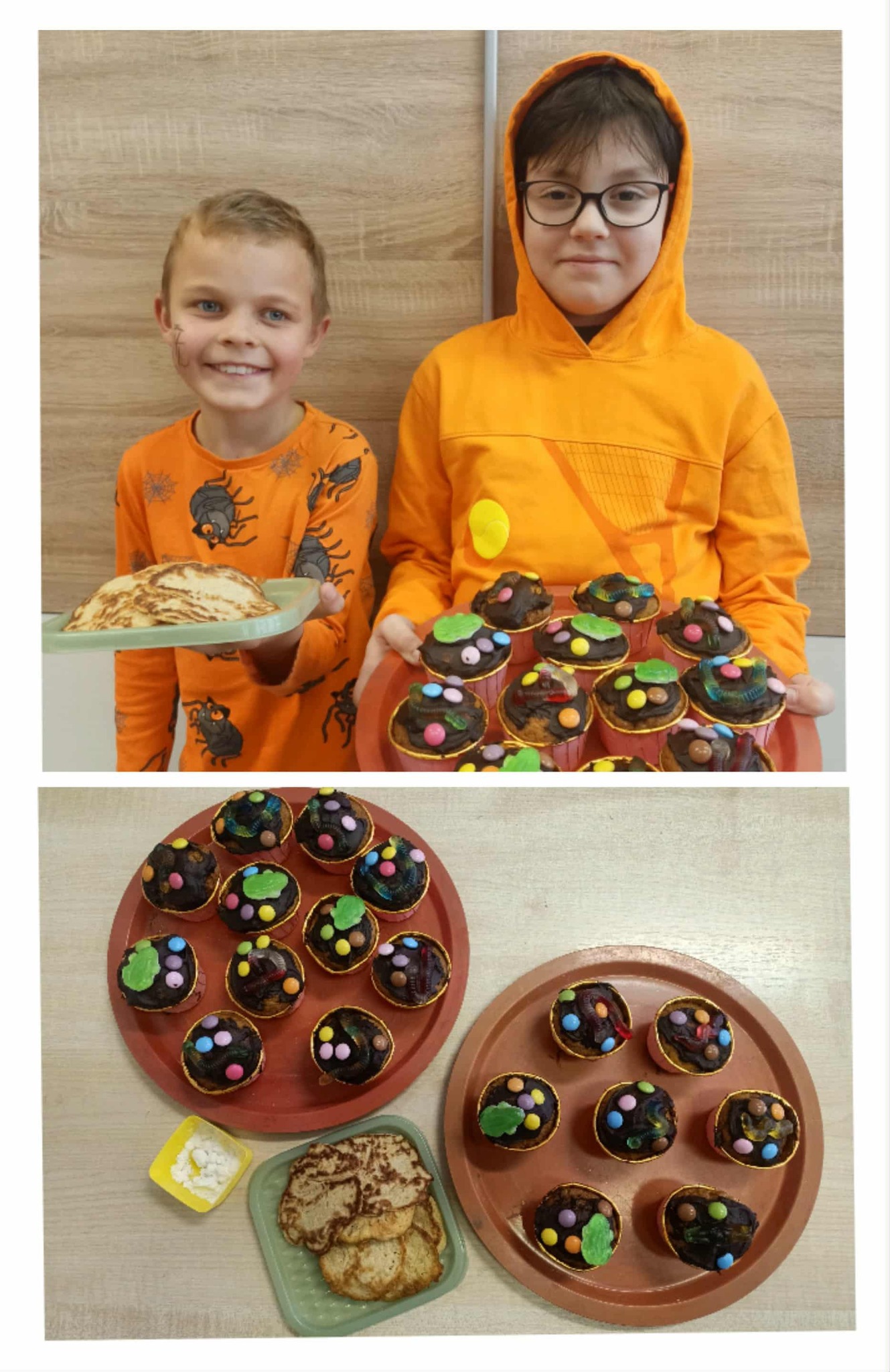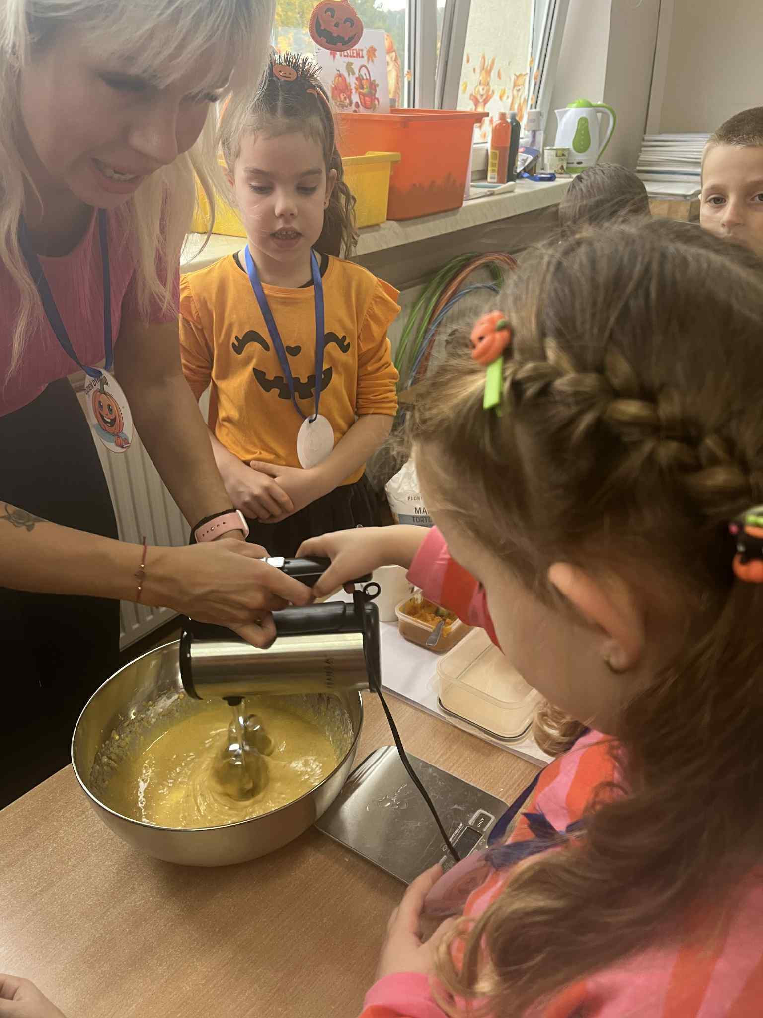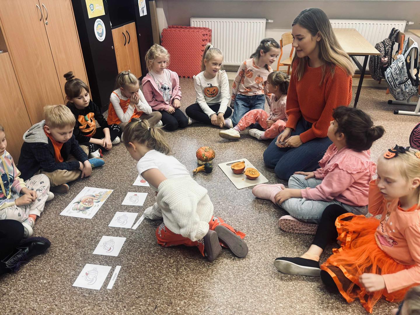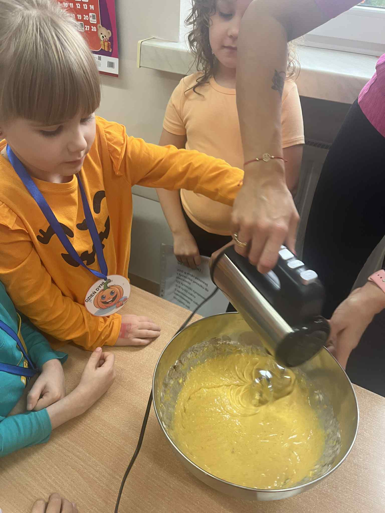 W klasie 0b DZIEŃ DYNI okazał się naprawdę wyjątkowy. Na początku poznaliśmy wiele ciekawostek o dyni – dowiedzieliśmy się, gdzie rośnie, jakie ma odmiany i dlaczego jest taka zdrowa. Potem mieliśmy okazję rozłożyć prawdziwą dynię na części! Każdy z nas mógł zajrzeć do środka, czyścić dynię z pestek, a także powąchać surową i pieczoną dynię, by porównać ich zapachy. Nie zabrakło też matematyki – przeliczaliśmy dynie i ważylismy składniki, które wykorzystaliśmy podczas wspólnego pieczenia. Wspólnymi siłami przygotowaliśmy mini gofry dyniowe – każdy dodał coś od siebie, wsypując produkty do miski i pomagając w mieszaniu. Tworzyliśmy też ciekawe prace plastyczne. To był dzień pełen nauki przez zabawę, zapachów, smaków i uśmiechu!