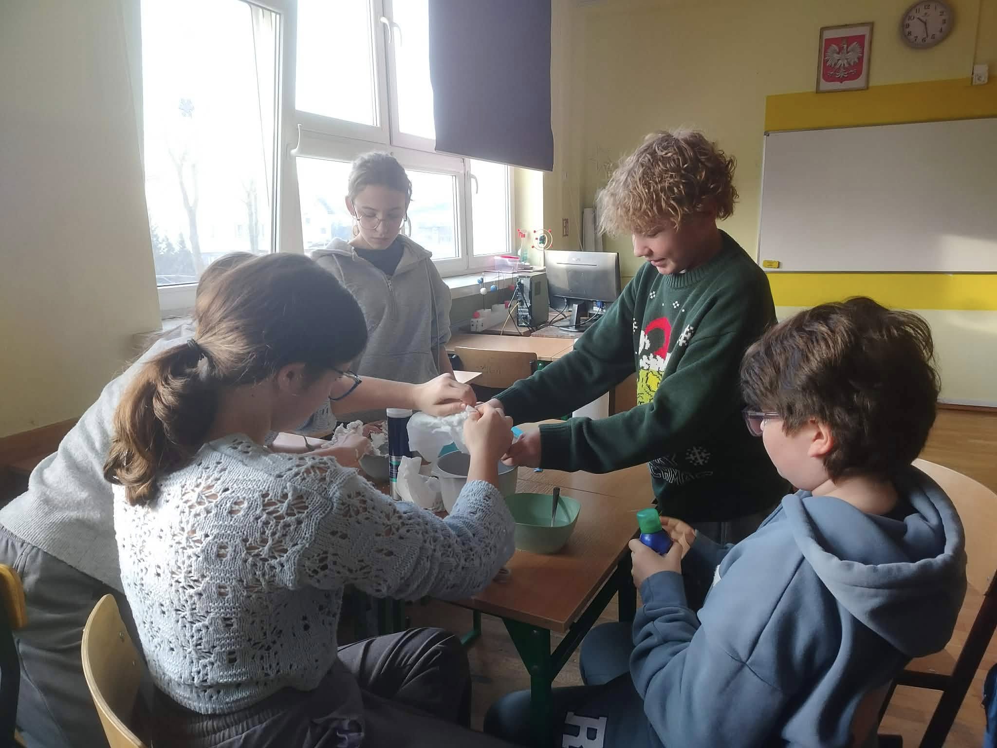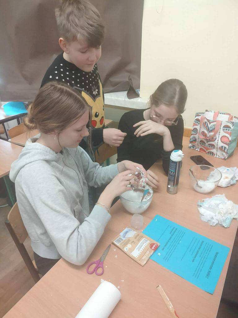 Tematem były: Substancje wokół nas. Uczniowie dowiedzieli się czym jest poliakrylan sodu, poznali jego właściwości i zastosowanie. Były również rozmowy na temat zastosowania octu i sody przy świątecznych porządkach. Na koniec przy świątecznej muzyce wykorzystali omawiane substancje do produkcji sztucznego śniegu. Uczniowie wesoło i z dużym zaangażowaniem zakończyli ostatnie lekcje chemii w starym roku