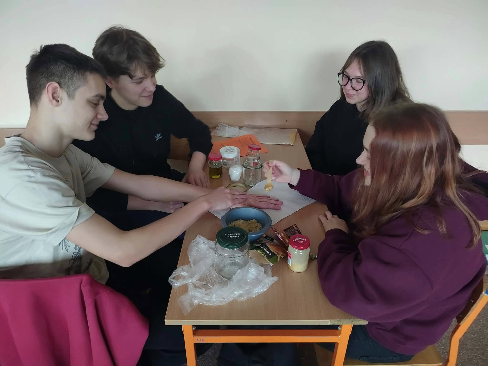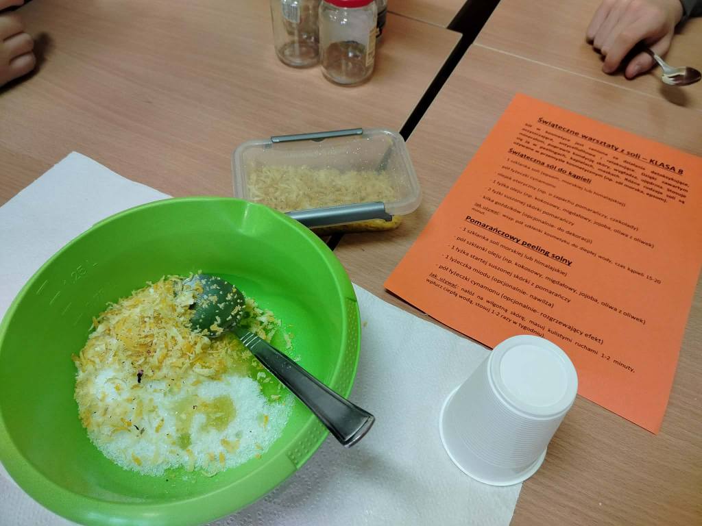 Uczniowie podczas warsztatów, omawiając dział o solach tworzyli świąteczne sole do kąpieli i peelingi do ciała. Dowiedzieli się, że sól w kosmetyce ma między innymi działanie antycellulitowe, odprężające, oczyszczające i relaksujące.