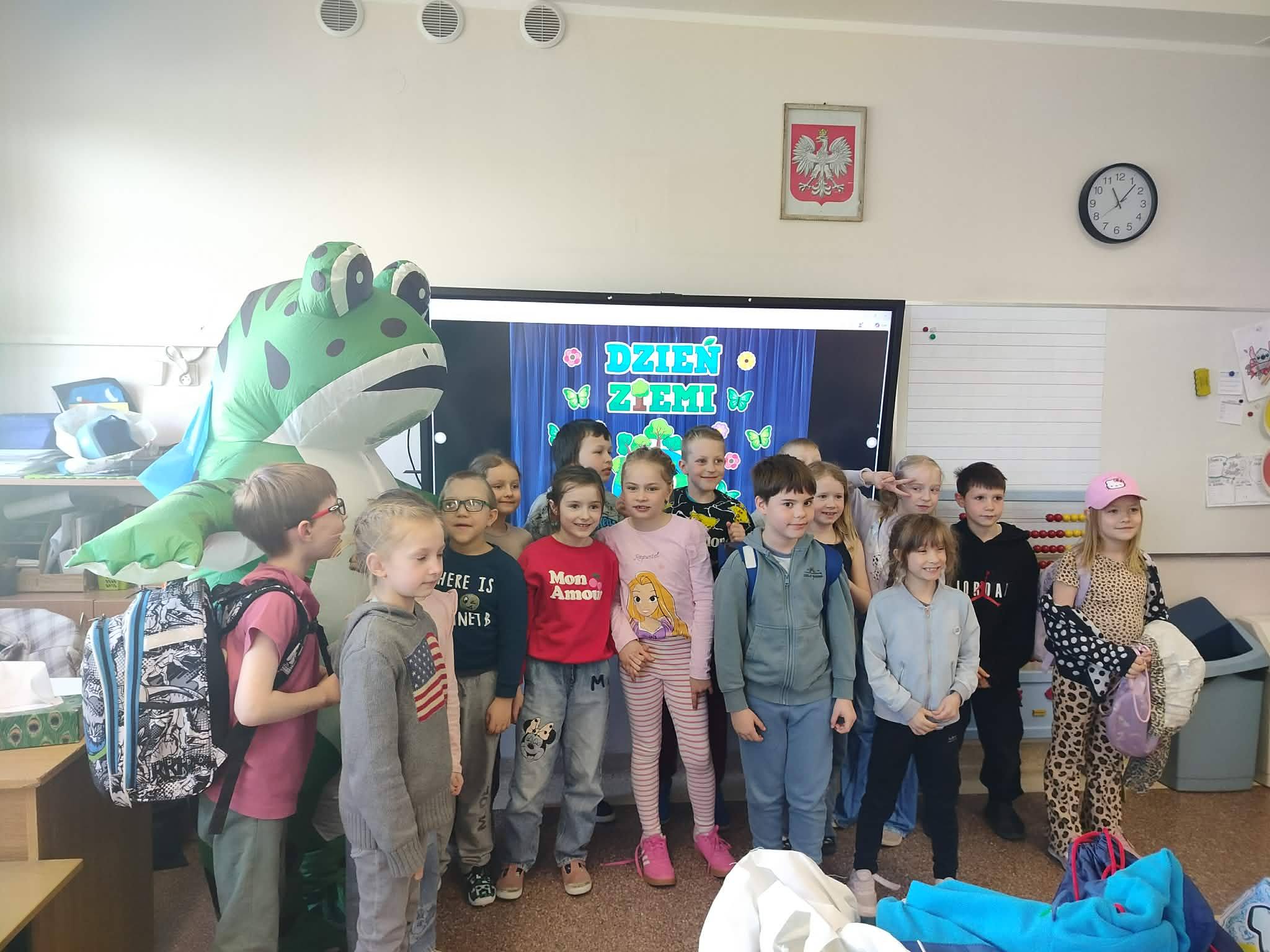 Dodatkową atrakcją wydarzenia był gość specjalny – sympatyczna żaba, w którą wcielali się uczniowie. Jej obecność wywoływała radosną atmosferę wśród dzieci.Dzień Ziemi w naszej szkole był okazją do wspólnej zabawy oraz zwiększenia świadomości ekologicznej.