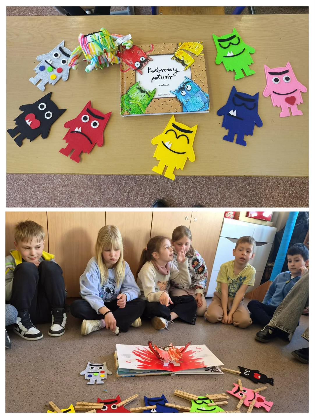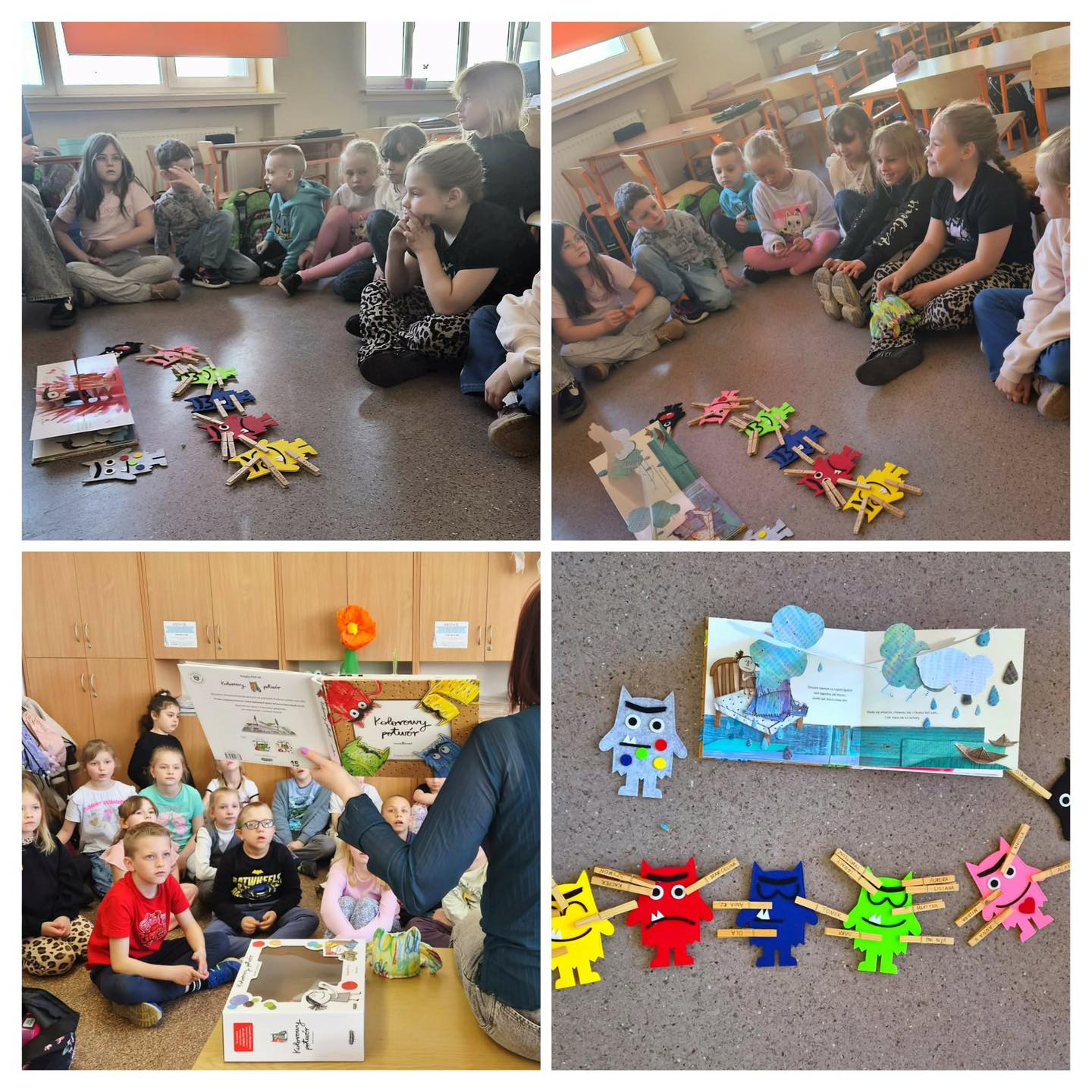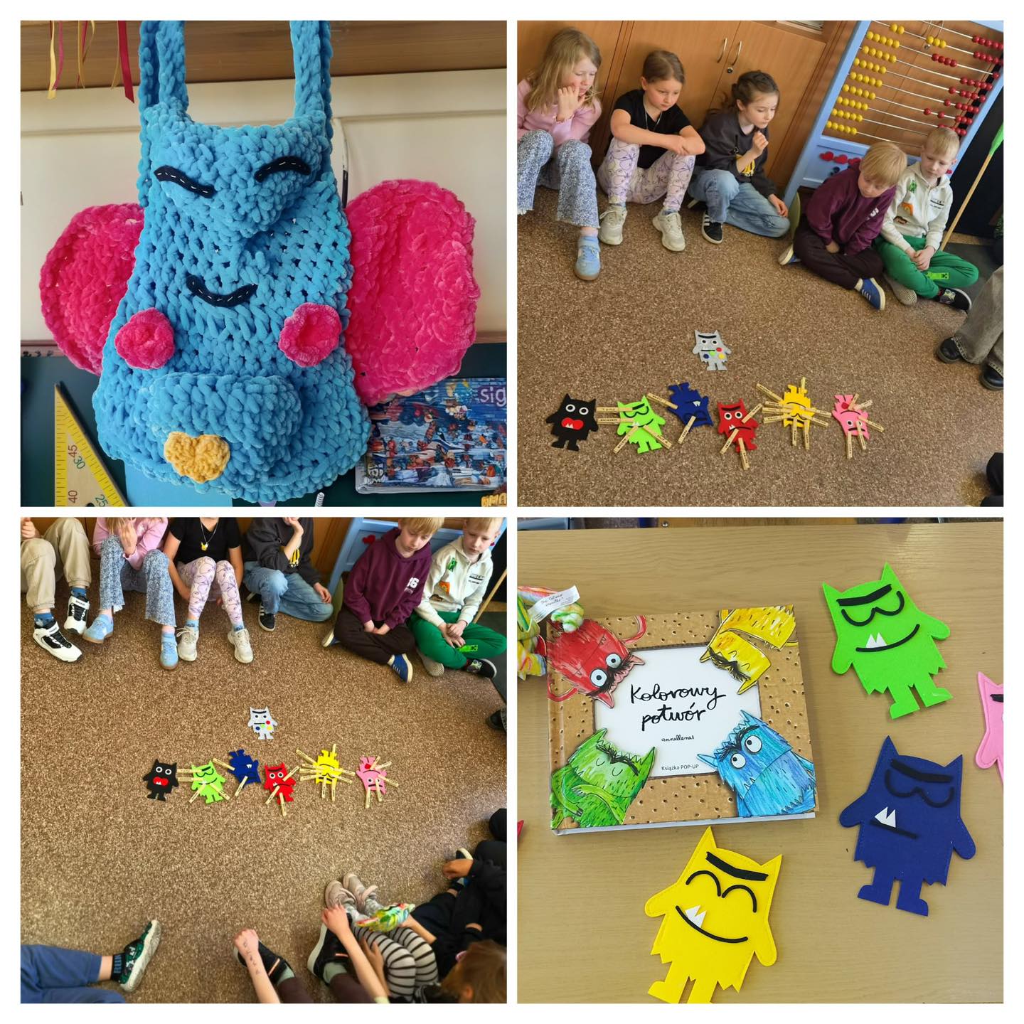 Dzień Książki podczas zajęć opiekuńczo - wychowawczych w klasie 0a.W tym dniu poznaliśmy etapy powstawania książki. Wiemy już, jak wiele osób jest zaangażowanych w proces jej tworzenia. Dzieci podjęły próbę stworzenia własnej książeczki. Udekorowały też swoje drewniane zakładki, a na koniec otrzymały dyplomy z okazji Dnia Książki.