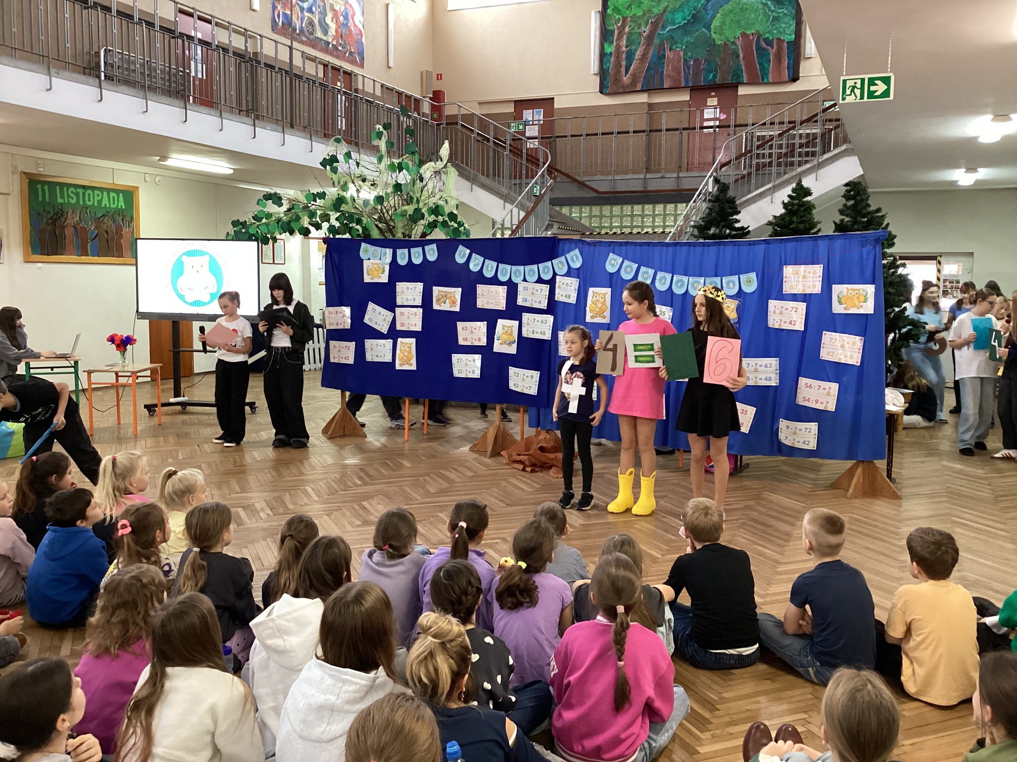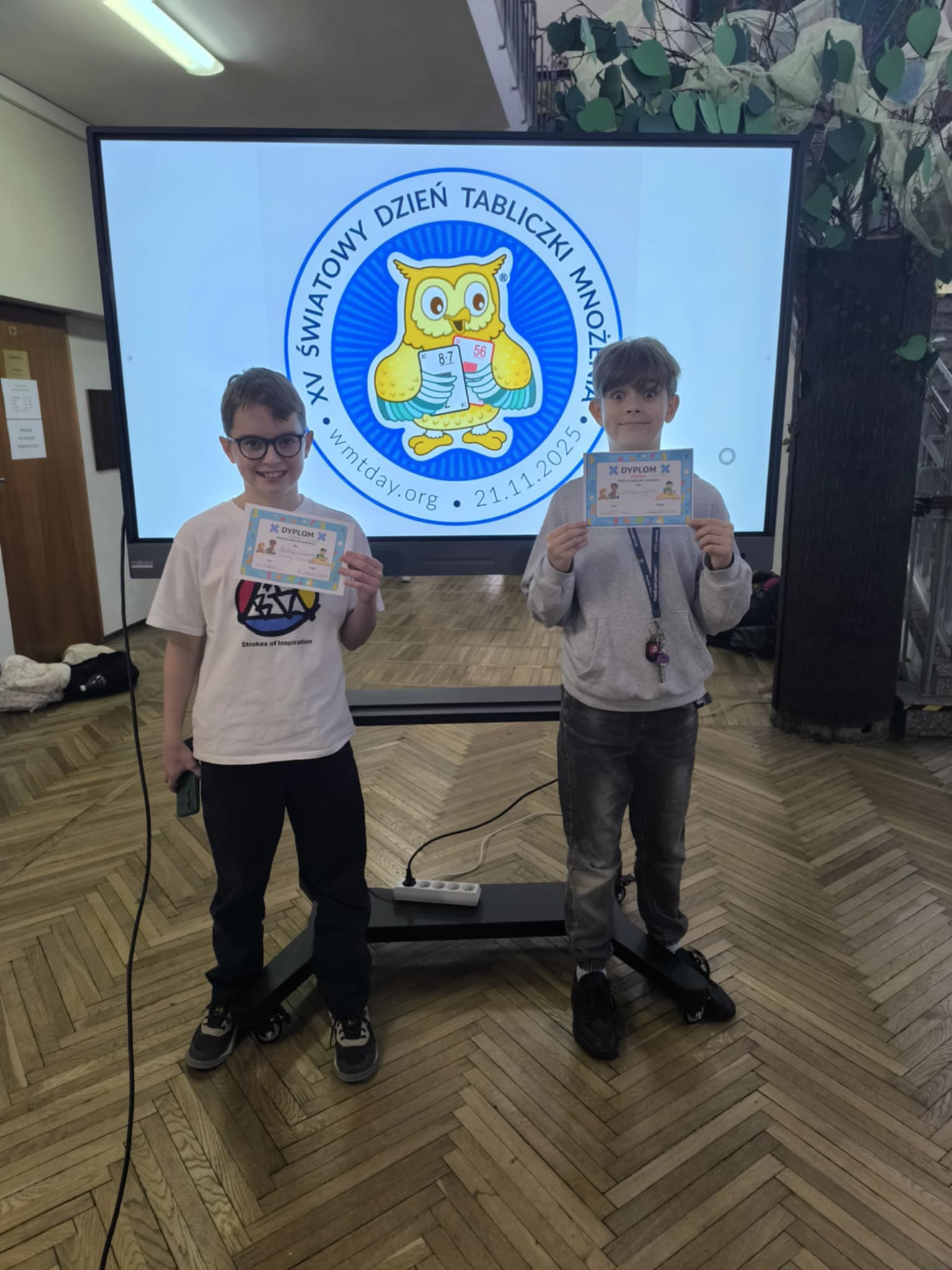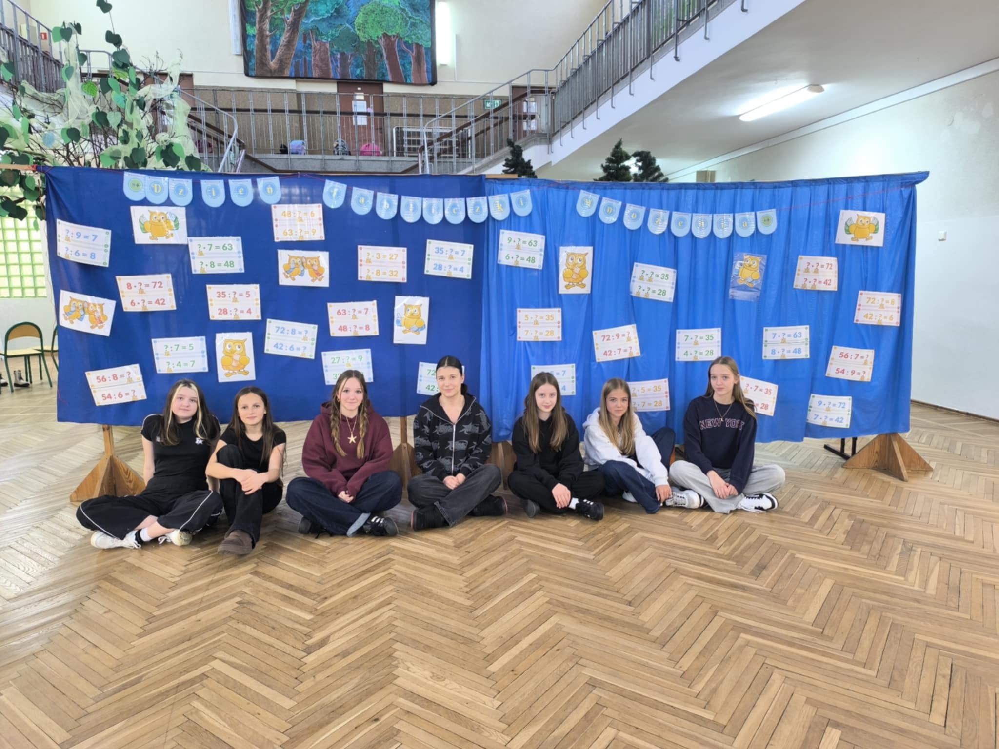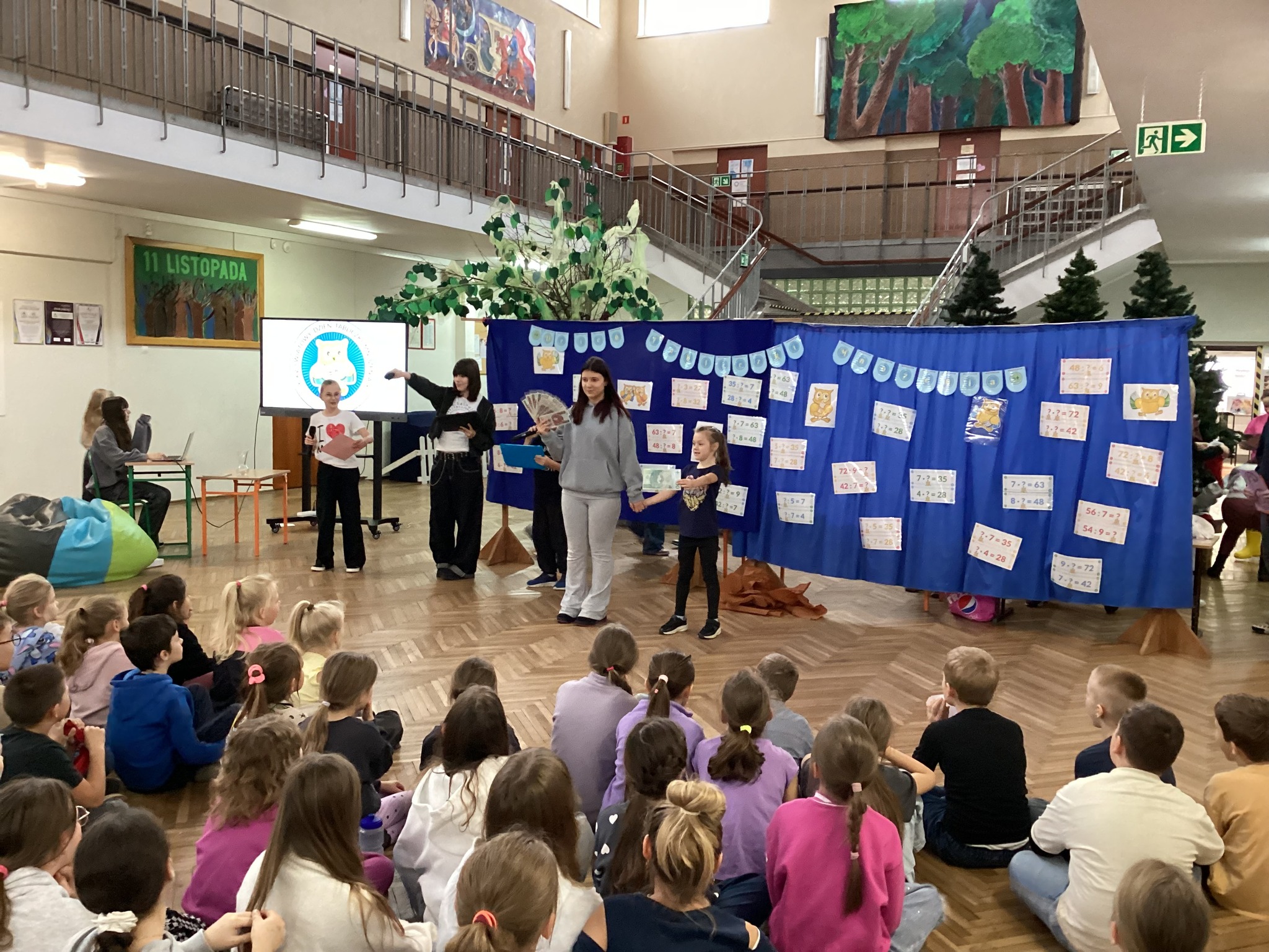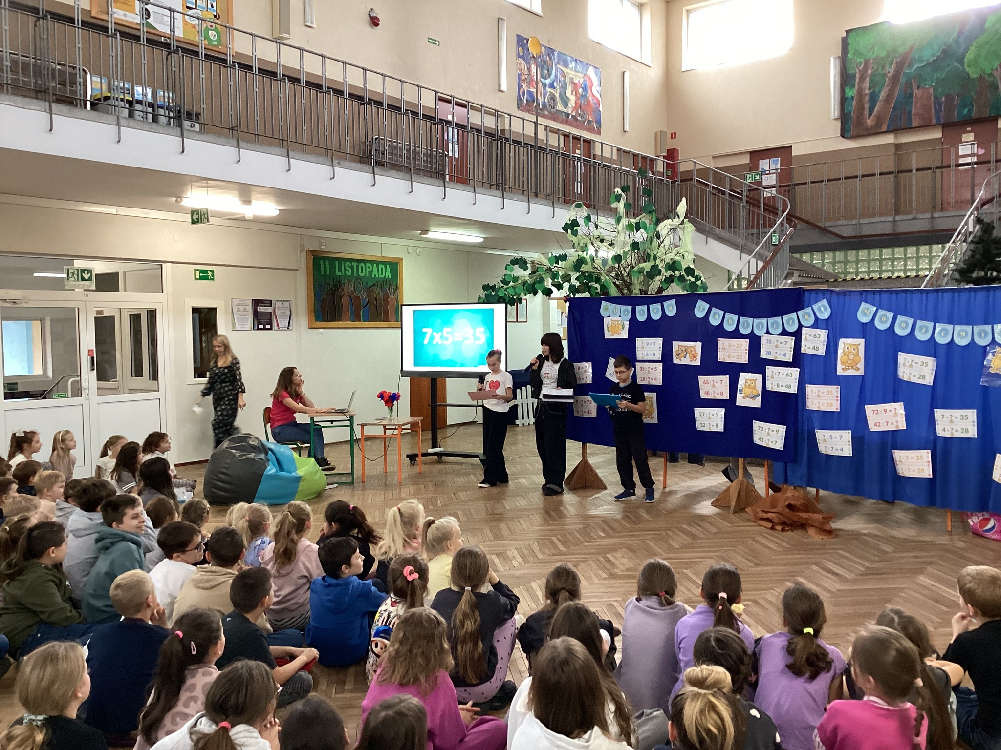 W piątek 21.11.2025 r. nasza szkoła po raz kolejny uczestniczyła w akcji Światowy Dzień Tabliczki Mnożenia. Była to świetna okazja dla wszystkich do przypomnienia sobie tabliczki mnożenia. Tego dnia wyłoniono Klasowych Mistrzów Tabliczki Mnożenia klas 4-6, następnie szkolnego mistrza. Na długich przerwach wszyscy chętni uczniowie mieli możliwość wzięcia udziału w krótkim teście z tabliczki mnożenia. Za podanie wszystkich poprawnych odpowiedzi, zdobywali odznakę. W przypadku pomyłki, była możliwość powtórzenia testu po godzinie. Cała społeczność szkolna aktywnie uczestniczyła w akcji!Miłą i pożyteczną zabawę z matematyką zapoczątkowało przedstawienie, podczas którego uczniowie za pomocą rymowanek przypomnieli większość przykładów.