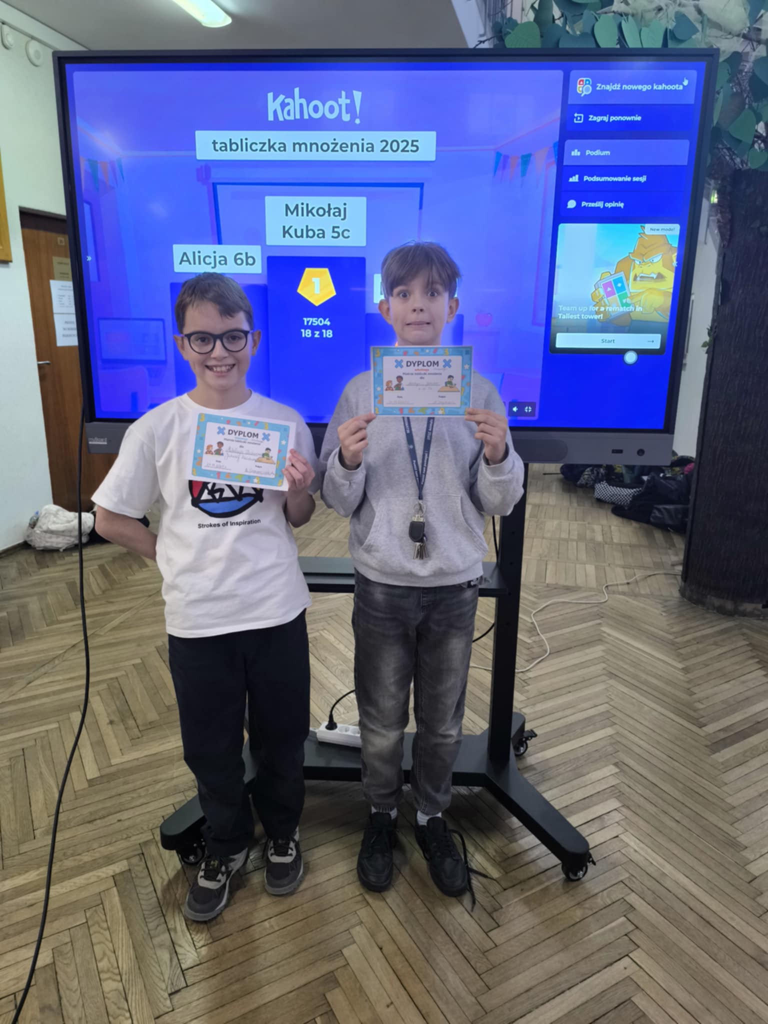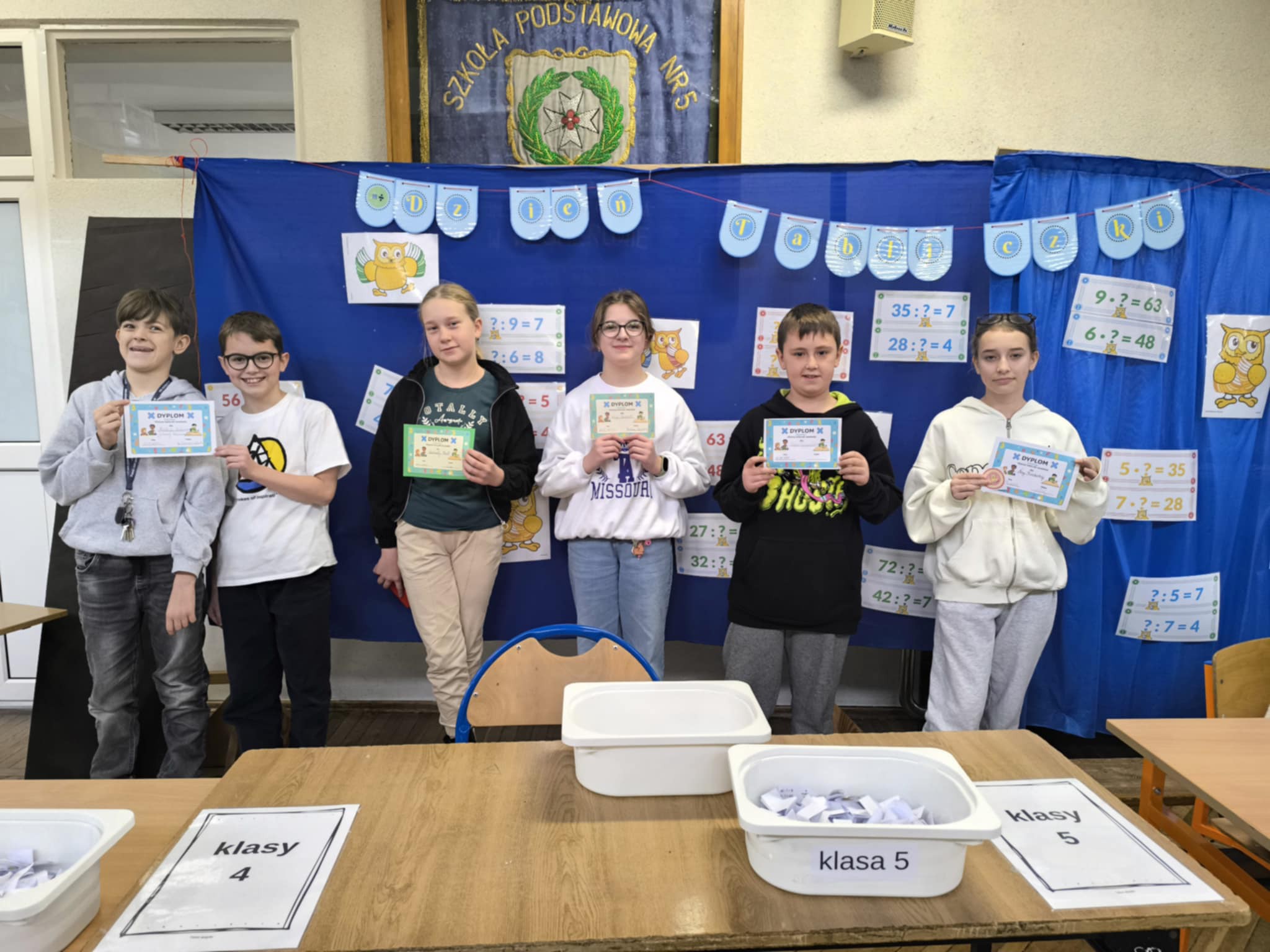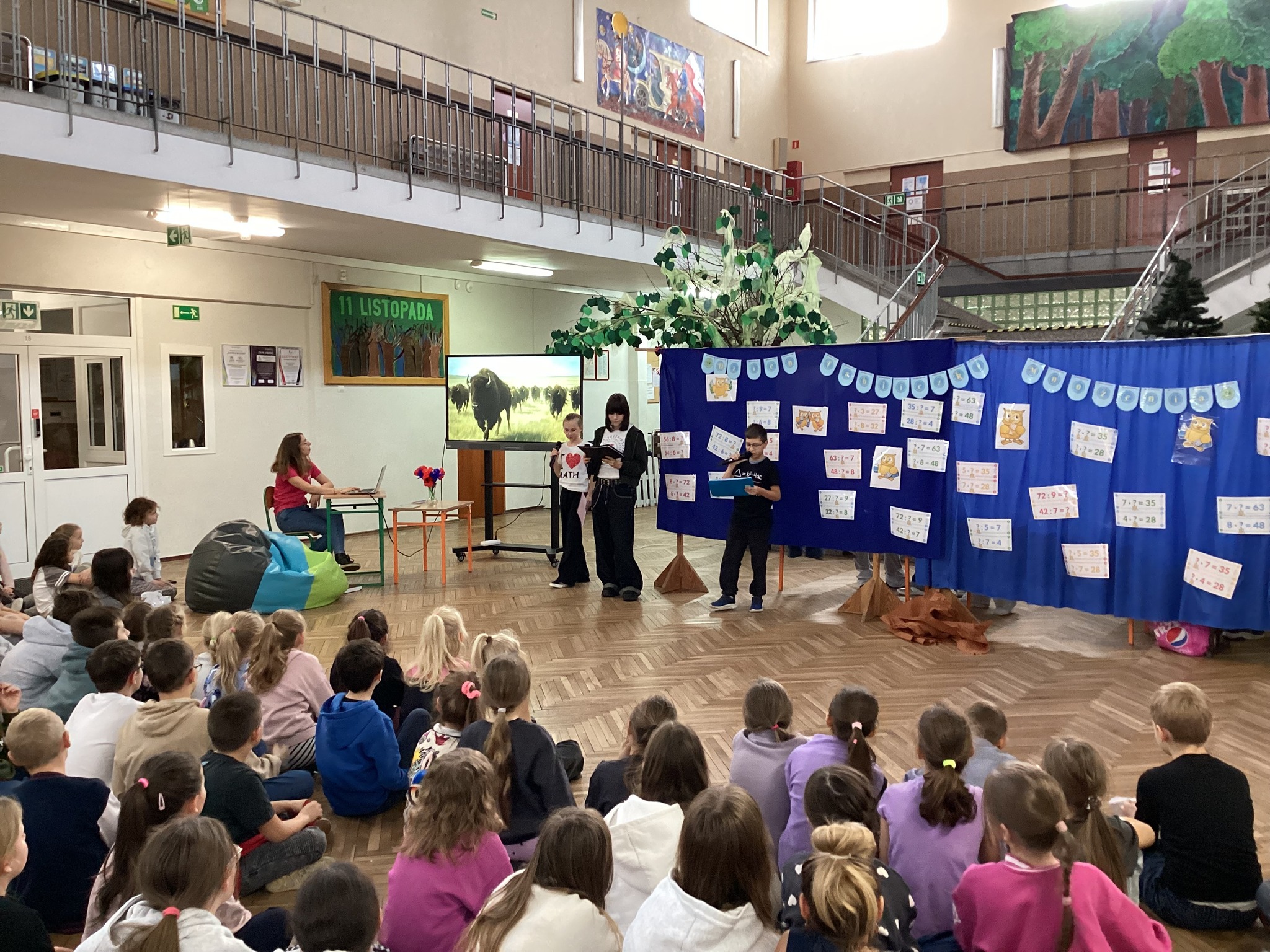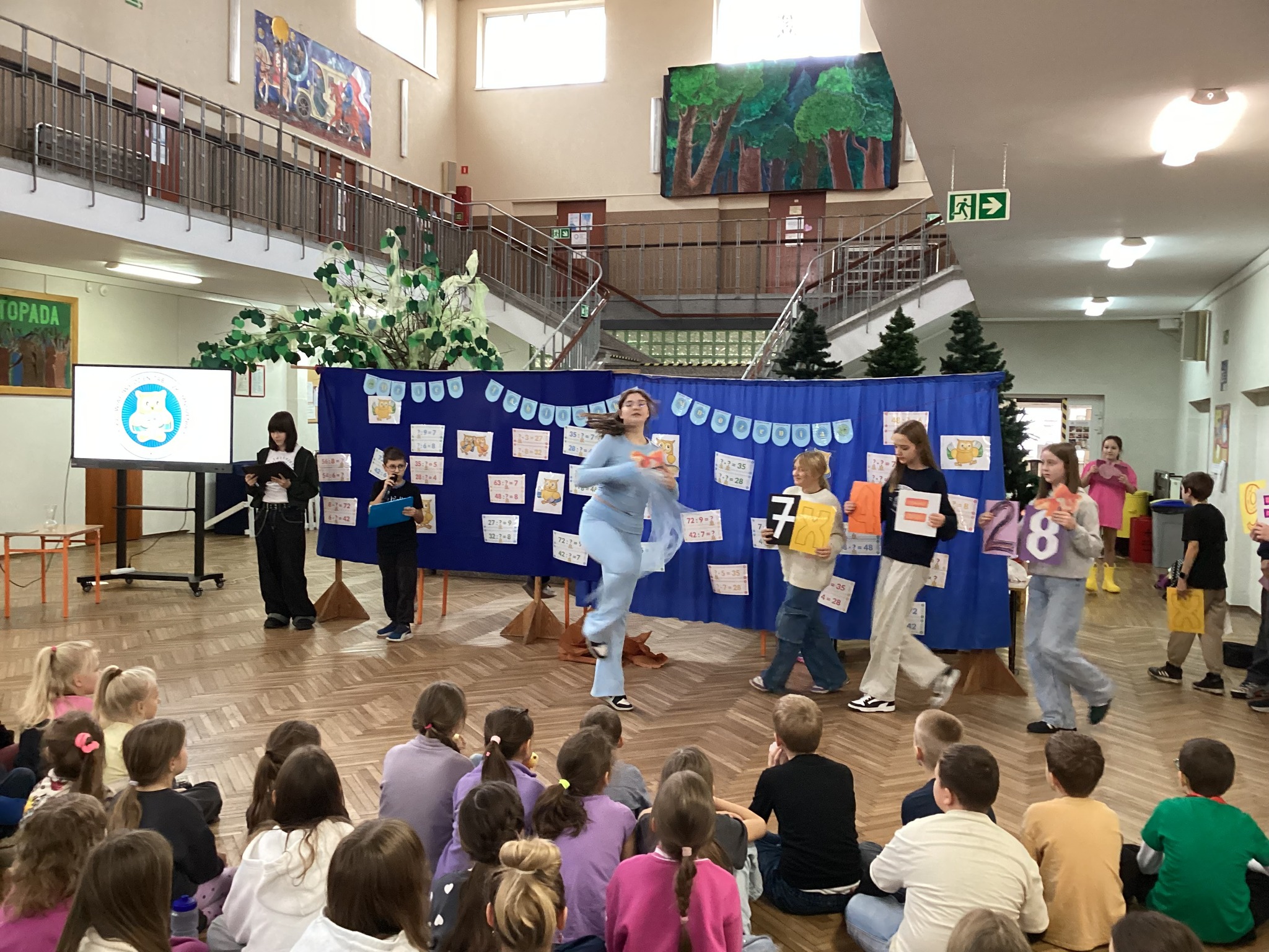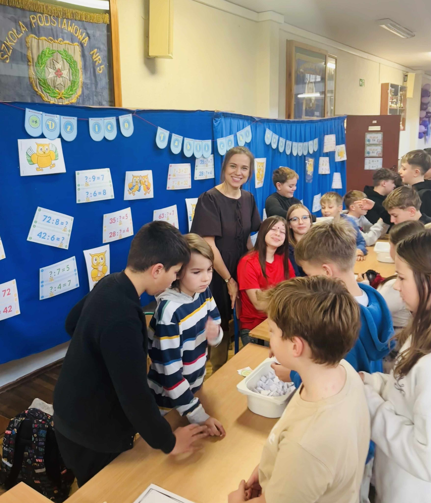 W piątek 21.11.2025 r. nasza szkoła po raz kolejny uczestniczyła w akcji Światowy Dzień Tabliczki Mnożenia. Była to świetna okazja dla wszystkich do przypomnienia sobie tabliczki mnożenia. Tego dnia wyłoniono Klasowych Mistrzów Tabliczki Mnożenia klas 4-6, następnie szkolnego mistrza. Na długich przerwach wszyscy chętni uczniowie mieli możliwość wzięcia udziału w krótkim teście z tabliczki mnożenia. Za podanie wszystkich poprawnych odpowiedzi, zdobywali odznakę. W przypadku pomyłki, była możliwość powtórzenia testu po godzinie. Cała społeczność szkolna aktywnie uczestniczyła w akcji!Miłą i pożyteczną zabawę z matematyką zapoczątkowało przedstawienie, podczas którego uczniowie za pomocą rymowanek przypomnieli większość przykładów.