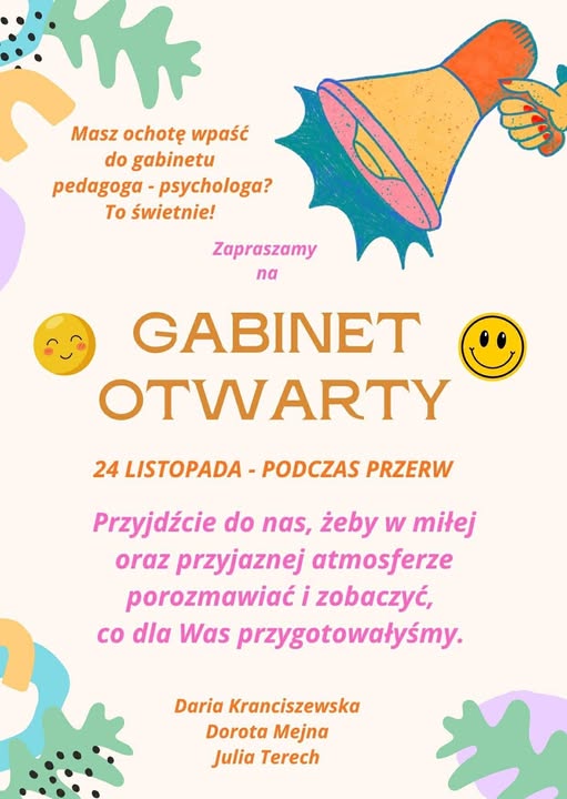 Masz ochotę zajrzeć do gabinetu pedagoga/psychologa? Świetnie! Już 24 listopada, podczas wszystkich przerw, zapraszamy do Gabinetu Otwartego.