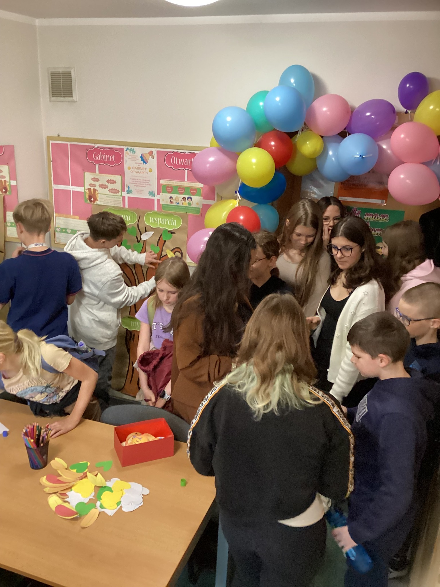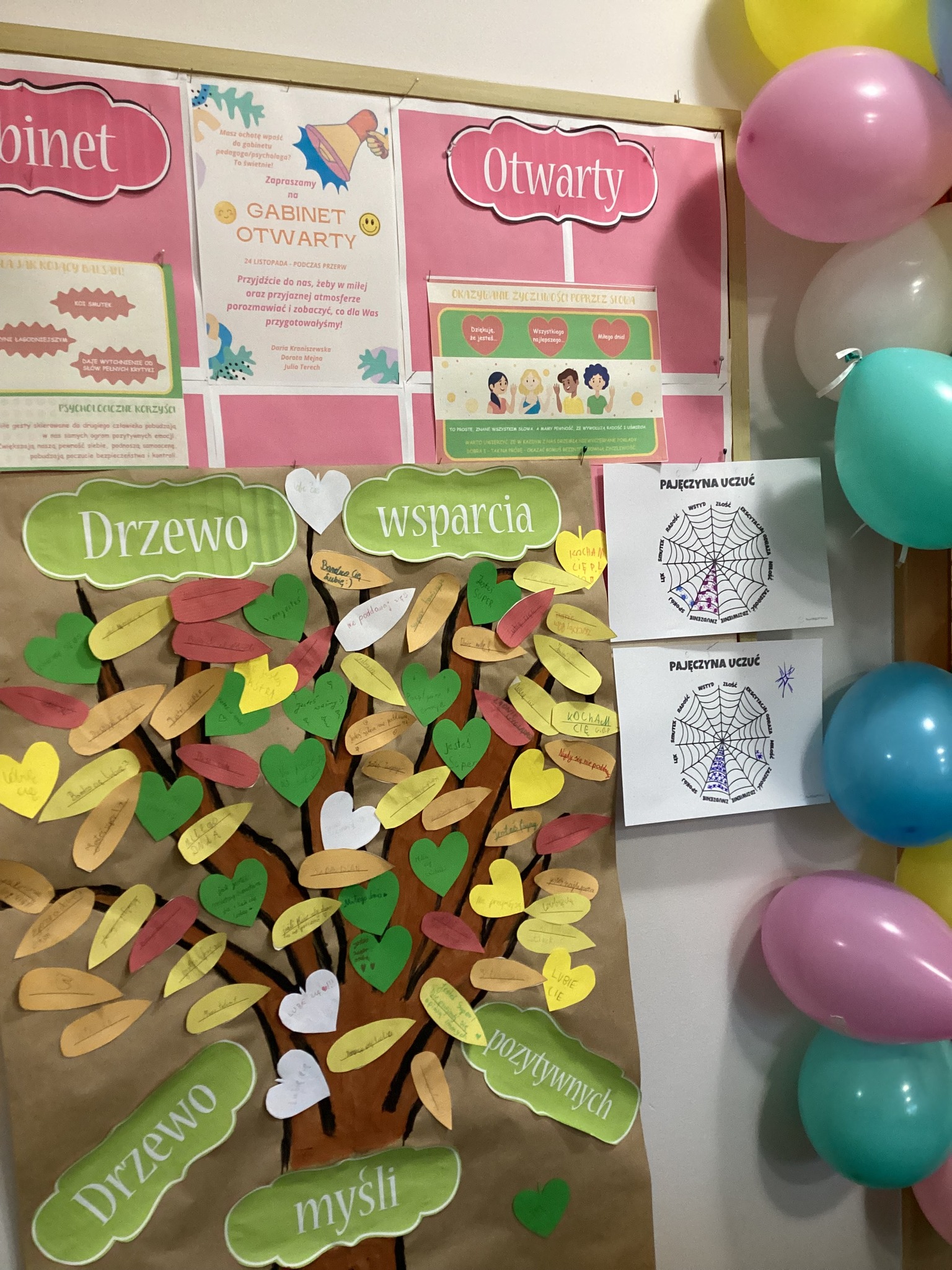 W poniedziałek 24 listopada wszyscy chetni uczniowie naszej szkoły wzięli udział w Gabinecie Otwartym. Dziękujemy za to i cieszymy się, że tak wiele osób skorzystało z przygotowanych aktywności i poświęciło chwilę na rozmowę. Drzewo Wsparcia szybko zapełniło się Waszymi dobrymi słowami, Kącik Emocji pokazał całą paletę nastrojów a Słoik Dobrych Wyzwań cieszył się bardzo dużym zainteresowaniem. Miło było Was gościć i spędzić z Wami ten czas. Kolejne takie spotkanie planujemy na wiosnę, o szczegółach będziemy informować.