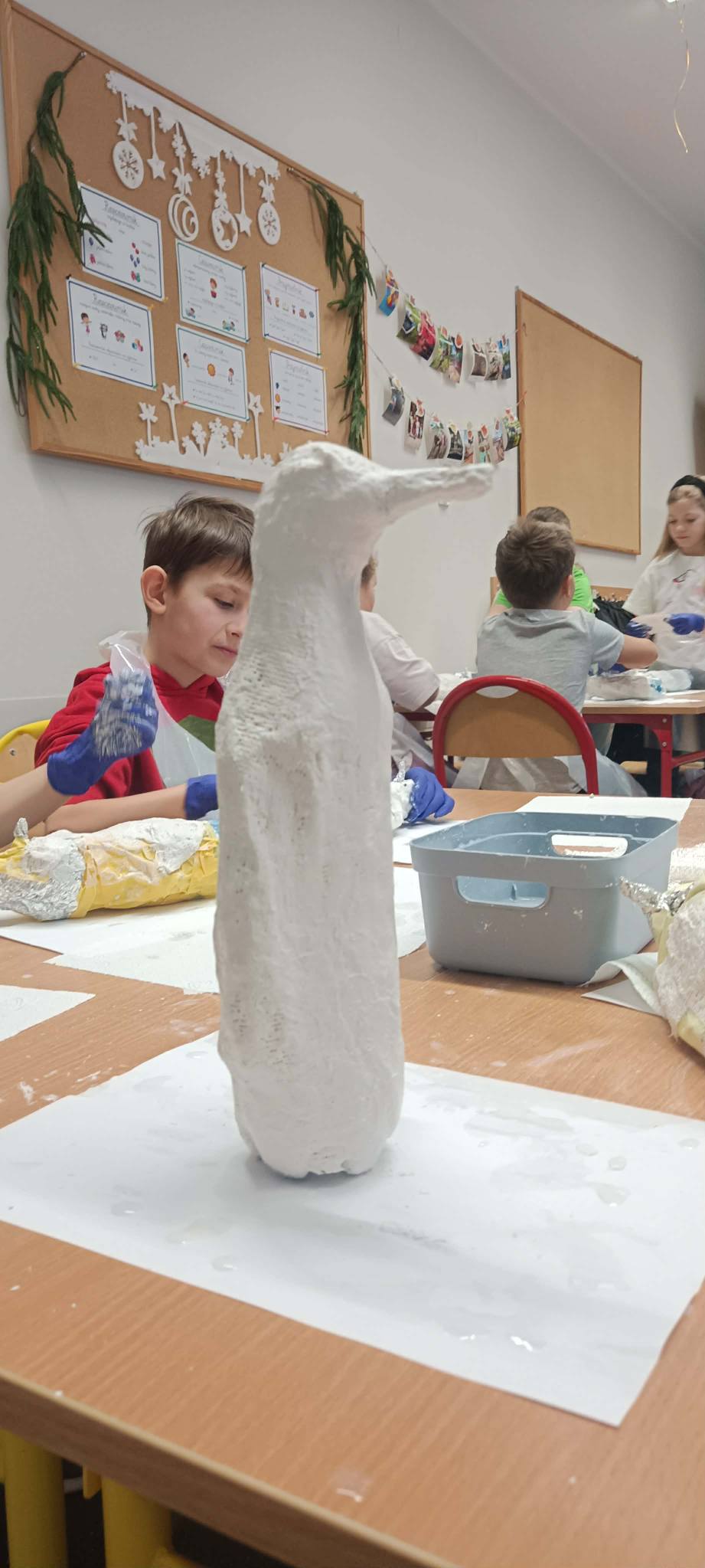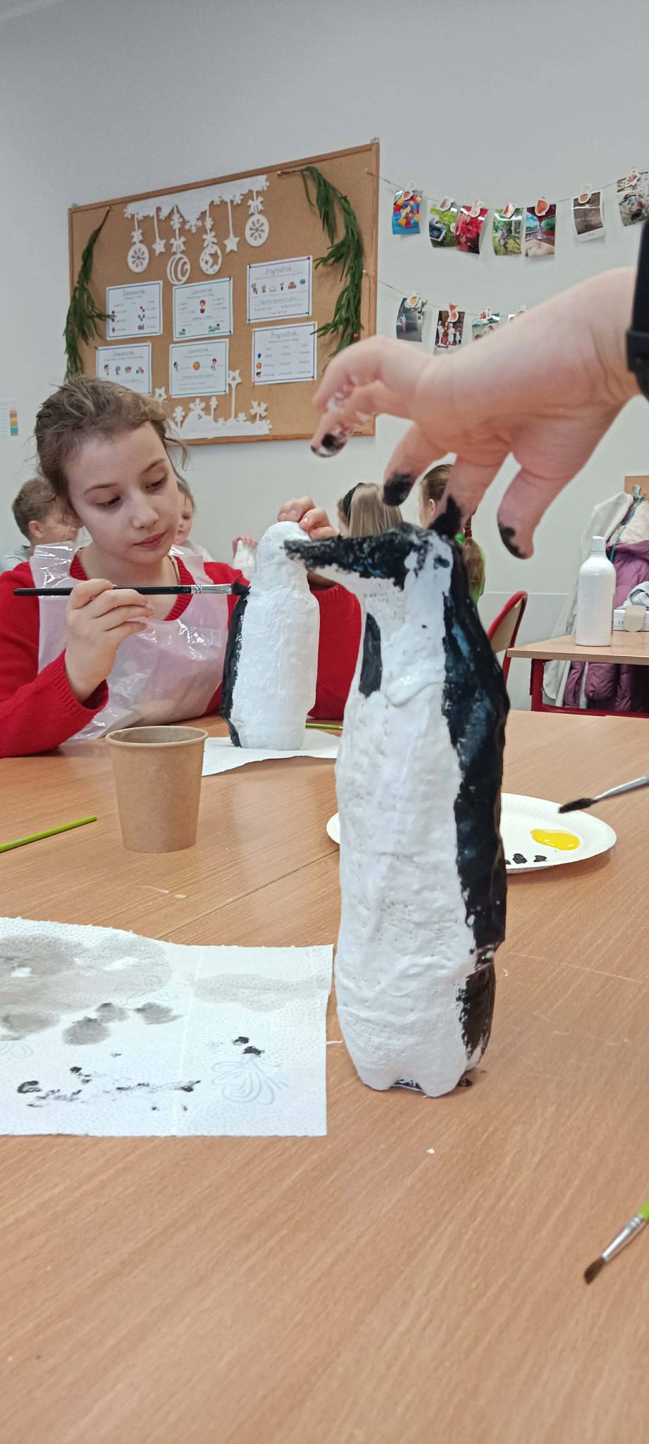 Podczas pracy plastycznej uczniowie klasy 2a przenieśli się na mroźną Antarktydę! W nawiązaniu do lektury „Zaczarowana zagroda” dzieci wykonały przepiękne, pomysłowe pingwiny.