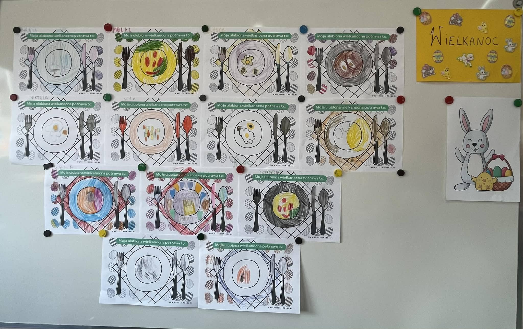 Szczególną uwagę poświęciliśmy potrawom wielkanocnym – dzieci chętnie opowiadały o swoich ulubionych daniach. Następnie każde z nich wykonało pracę plastyczną, rysując swoją ulubioną potrawę wielkanocną.