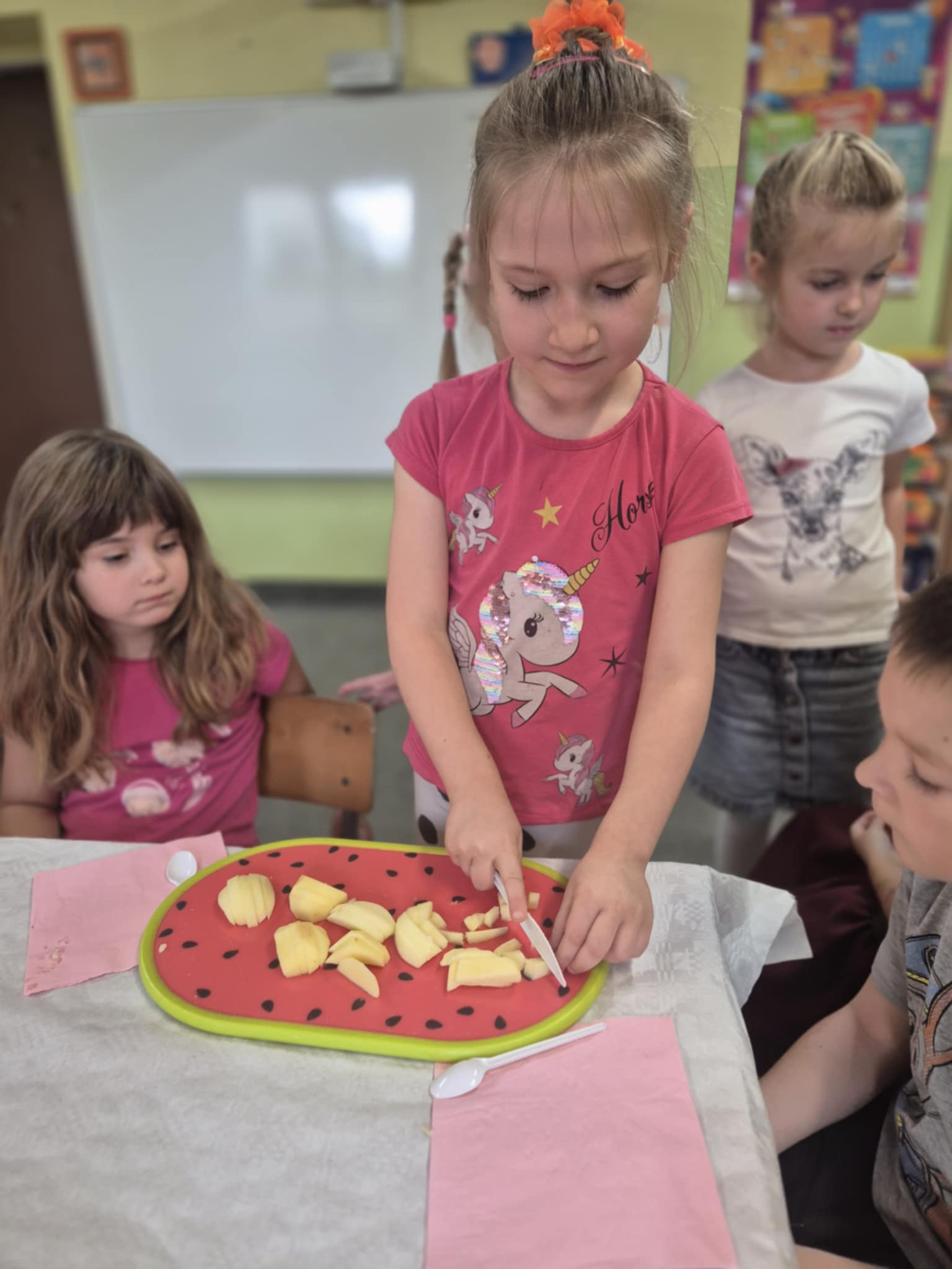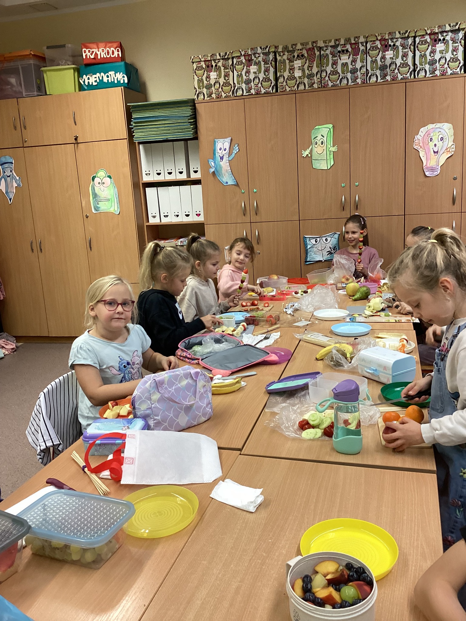 Uczniowie z klasy 0A poznawali piramidę zdrowego odżywiania i zastanawiali się, jak wygląda zdrowy posiłek. Zwieńczeniem tygodnia było stworzenie pysznych, kolorowych i pełnych witamin owocowych szaszłyków. Było zdrowo, smacznie i bardzo wesoło!