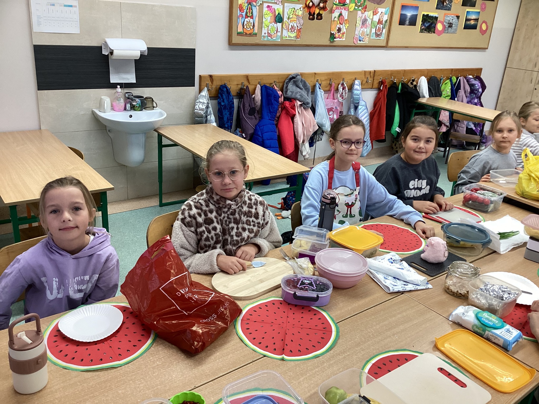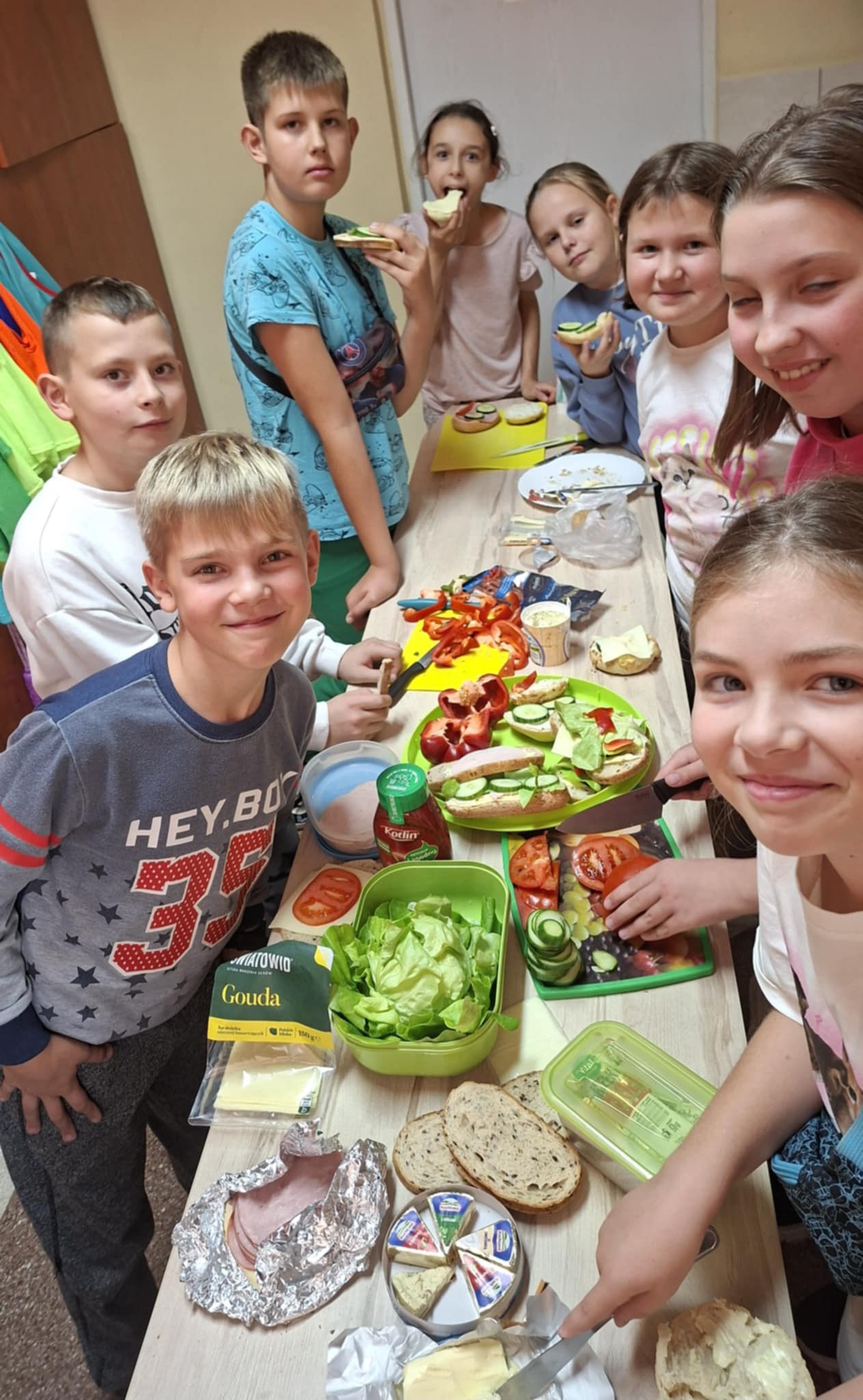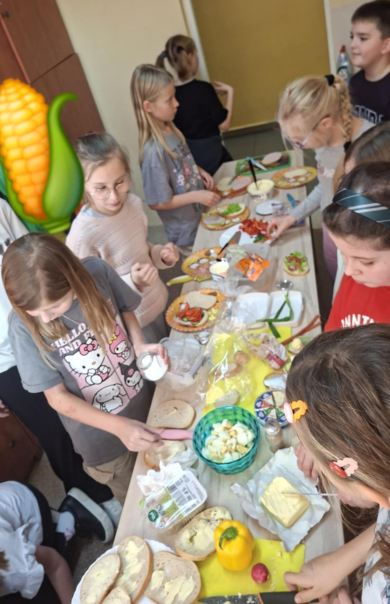 29.10.2025 r. uczniowie z klas: 4a, 4b oraz 5b w ramach zajęć z edukacji zdrowotnej przygotowali pyszne, kolorowe kanapeczki. Jak widać zajęcia o tematyce żywieniowej w formie praktycznej, sprawiły uczniom mnóstwo radości.