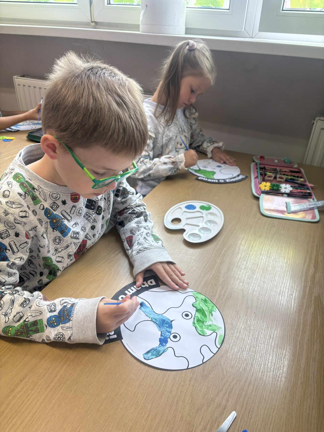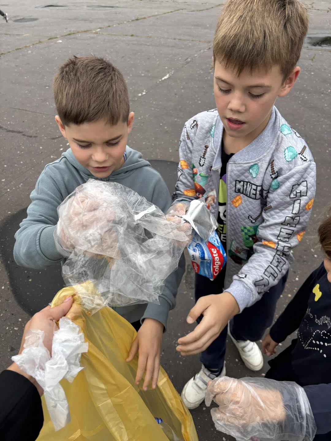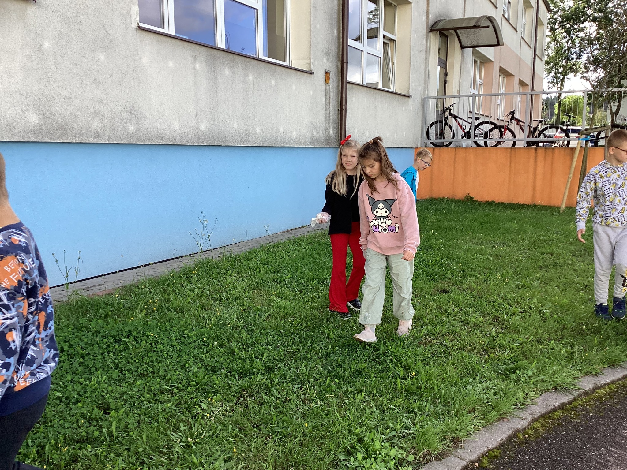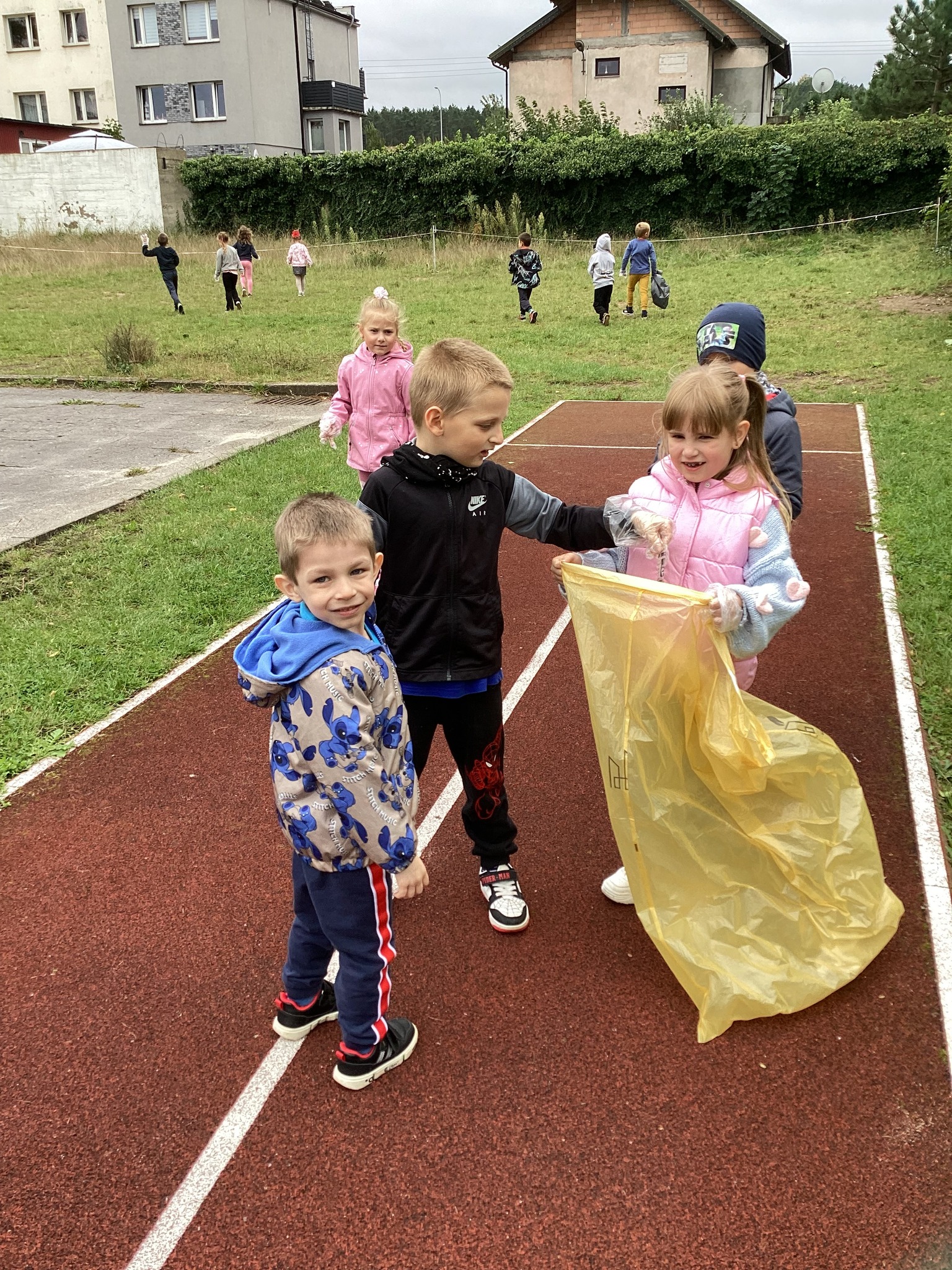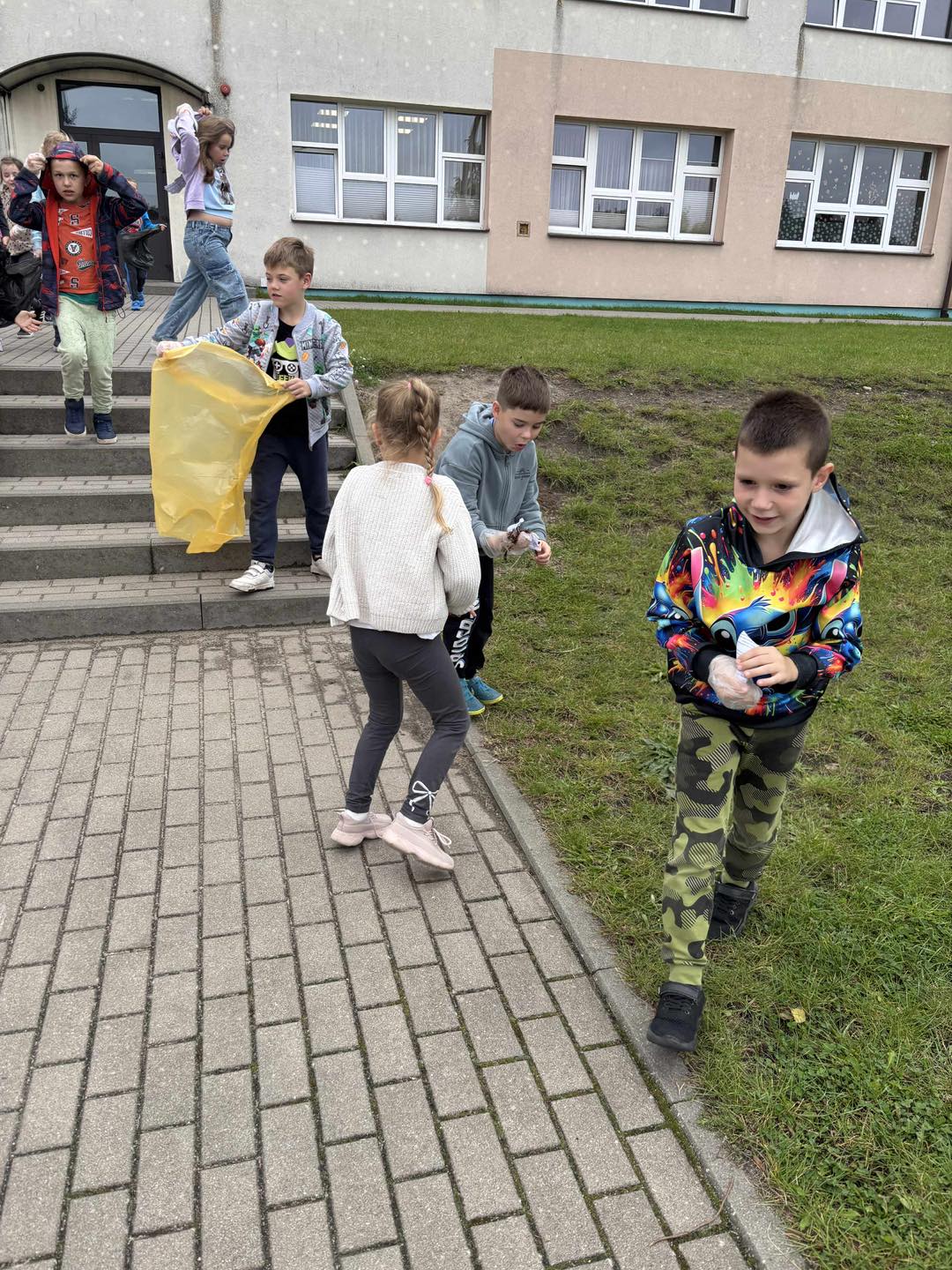 o środowisko. Na zakończenie dzieci z zaangażowaniem sprzątały teren szkoły, ucząc się, że nawet małe działania mają duże znaczenie dla naszej planety.