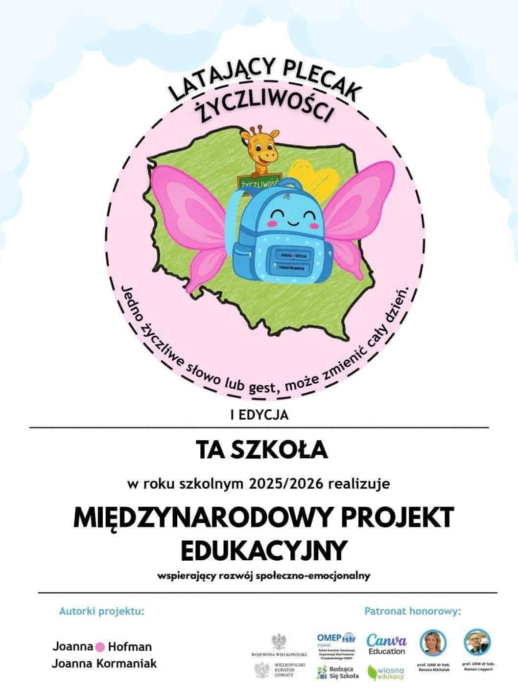 Latający Plecak Życzliwości to międzynarodowy projekt edukacyjny, w którym biorą udział klasy pierwsze z naszej szkoły. W klasie 1a rozpoczęliśmy działania od zapoznania się z niezwykłą książką Drew Daywalta ,, Dzień, w którym kredki miały dość". Lektura bardzo przypadła dzieciom do gustu. Wykonaliśmy barwne ilustracje przedstawiające historię kredek. Otrzymaliśmy w ramach projektu plany lekcji i kartki życzliwości. Czekamy już z niecierpliwością na misje życzliwości, które będziemy realizować przez cały rok szkolny.