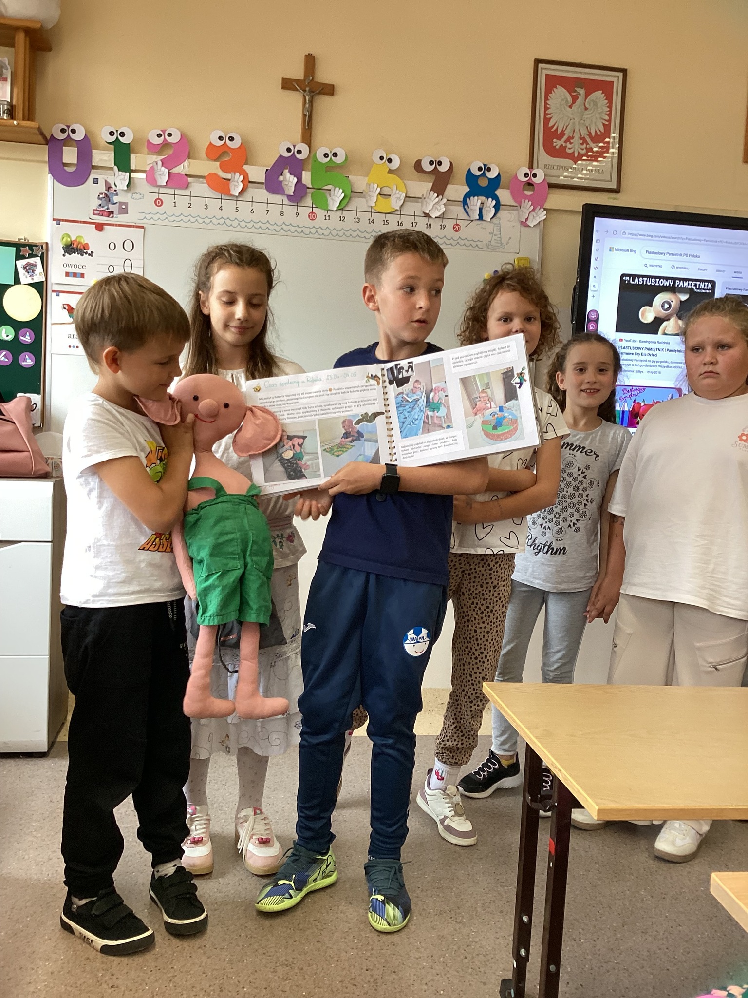 Uczniowie klasy 2a uroczyście przekazali Plastusia młodszym kolegom, uczniom klasy 1c. Zapoznali ich z przygodami małego Plastusia i opowiedzieli jak stworzyć klasowy pamiętnik.