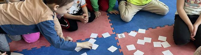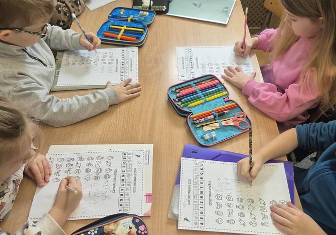 Uczniowie klasy 0a podjęli próbę odkodowania zaszyfrowanych wyrazów. Poszło im znakomicie. Nie brakuje też u nas zabaw ruchowych, podczas których zabawa i radość nie mają końca.